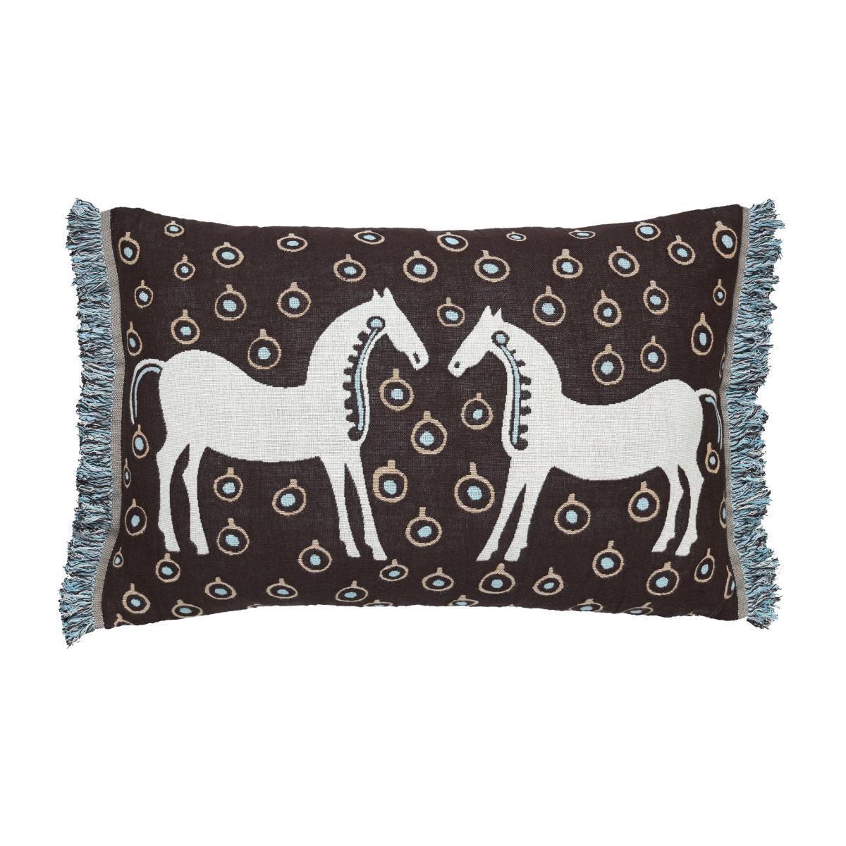 PLEASE NOTE: cushion cover sold on its own (filling sold separately). The Musta tamma (black mare) pattern was created by Finnish textile designer Maija Isola (1927 - 2001), which is the origin of Marimekko's iconic floral pattern: Unikko. A designer and painter, Isola has often used the same motif in her paintings and textile creations. The Musta tamma pattern is inspired by memories of Isola's childhood, when she imagined that she was running freely in the woods with a large group of horses. Chic and graphic, the collection of textiles designed by Marimekko brings new life to your interior! Created in 1951, Marimekko is a state of mind, a way of life based on creativity, freedom of spirit and inventiveness. Its notoriety dates back to 1960, the year in which Jackie Kennedy made several public appearances in dresses designed by Marimekko. The brand went on to enjoy enormous success, which continues today with a range of clothing and decorative accessories in vibrant colours, for a house full of inspiration!.
