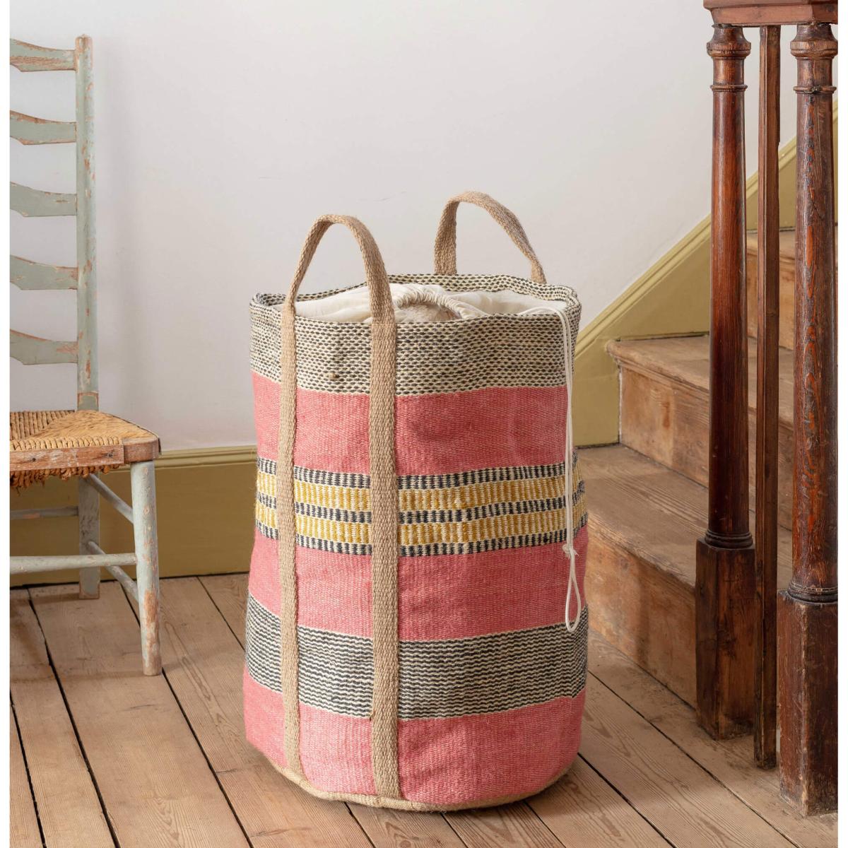 These laundry baskets are handwoven from thick jute yarns into beautifully intricate patterns and include two handles so you can easily move them around your home. Each one is extremely spacious, with plenty of room for the whole family’s weekly wash. Just inside the top of the baskets you’ll find a soft linen covering with a handy drawstring so your laundry can be hidden out of sight. H60 x W65 x D43cm. H72cm to the top of the handles. Handwoven from chunky jute for a long-lasting laundry basket. Linen drawstring covering to keep washing out of sight. Spot clean only.