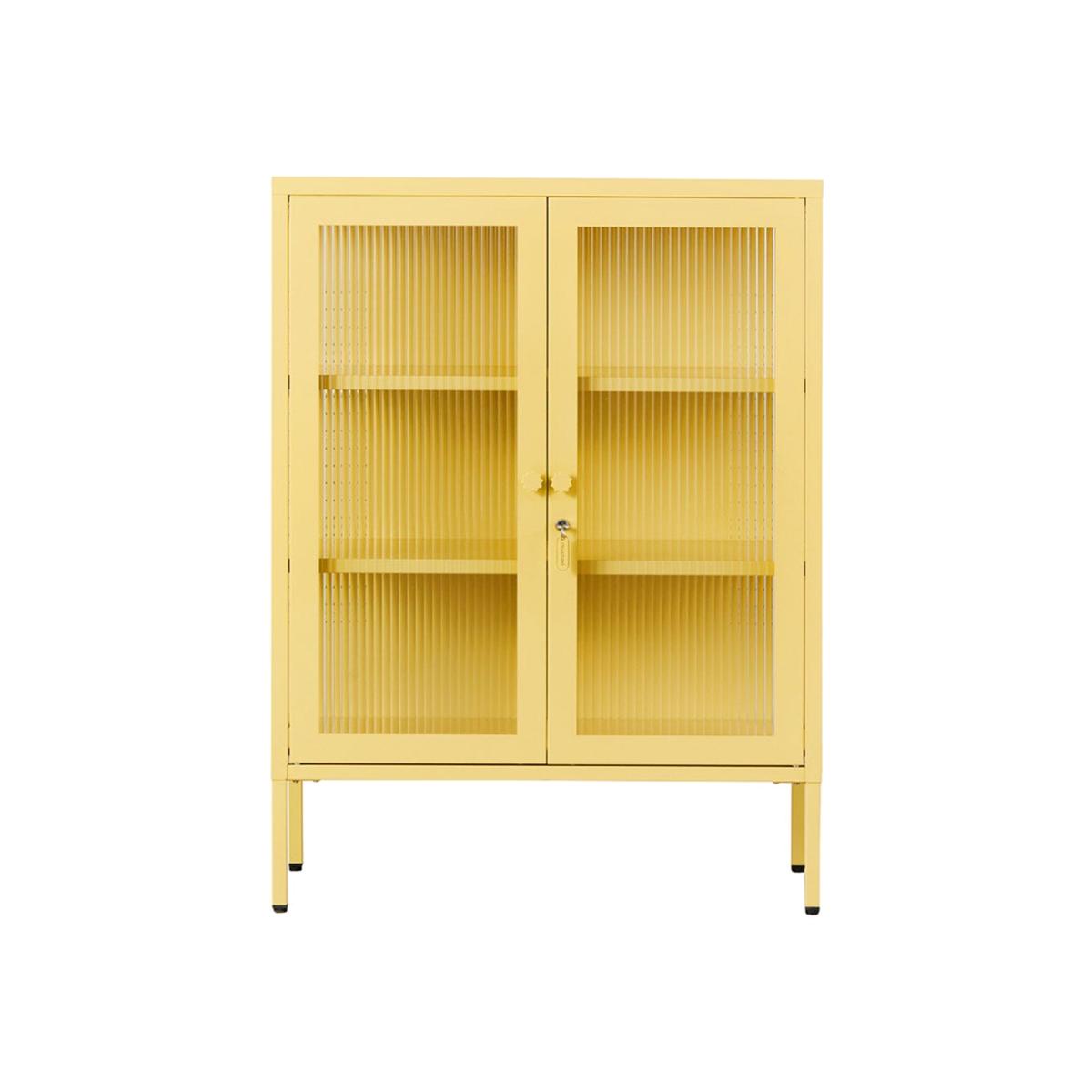 I’ve been leaning on the butter cabinet for its cheerful mustard tone and pared-back steel frame - it livens up both Scandi-inspired and industrial-edge schemes without feeling overly fussy. It’s ideal in a kitchen or home office, where you can stow away dishes or stationery behind those fluted-glass doors yet still let a glimpse of colour peek through. Styling tip: balance its warmth with cooler accents - think slate-grey walls or pale oak shelving - and avoid overfilling the shelves. A few ceramic jugs, neatly folded throws or green potted plants will add texture without crowding the look.