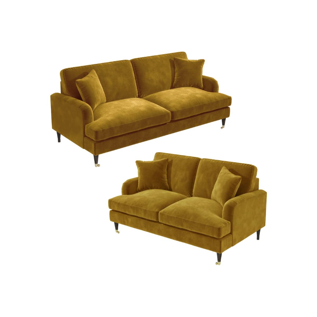 Foam filled Scatter Cushions Included This bundle includes : 1 x Payton Mustard Velvet 3 Seater Sofa1 x Payton Mustard Velvet 2 Seater Sofa Features we love Beautifully upholstered in a soft-to-touch mustard velvet fabric Saddle arms, tailored piping and deep, plump, seating gives it a modern silhouette Accompanied by two matching throw cushions for added style and comfort Stylish dark wood legs with gold accent front castors Both the seat and back cushions are filled with comfortable and spongey foam Minimum assembly; it's just a case of fixing the legs into position Cushion covers are removeable. To clean, we recommend using a damp cloth All about me Discover maximum comfort and minimum maintenance with these gorgeous sofas. This Payton three-seater and two-seater sofa bundle offers traditional styling with a modern twist thanks to its dark wooden legs with gold accent front castors and classic ruched saddle arms. Beautifully tailored and upholstered in beautiful mustard velvet, it brings a splash of elegance to your living space, making it the perfect statement piece. Adding this trend-setting bundle to your home is easy. There's minimum assembly; it's just a case of fixing the legs into position. Need to know Three Seater Sofa Dimensions Overall dimensions: H85 x W190 x D96 cm Seating dimensions:W164 x D60 cm Packed dimensions: No. of Boxes 1 - Weight 54kg – H61 x W192 x D98 cm Colour: Mustard Finish: Velvet upholstery and wooden legs Material: Velvet fabric, wooden frame and legs and metal castors Filling: Foam Assembly required:Yes Two Seater Sofa Dimensions Overall dimensions: H85 x W150 x D96 cm Seating dimensions:W124 x D60 cm Packed dimensions: No. of Boxes 1 - Weight 50kg – H61 x W152 x D98 cm Colour: Mustard Finish: Velvet upholstery and wooden legs Material: Velvet fabric, wooden frame and legs and metal castors Filling: Foam Assembly required: Yes