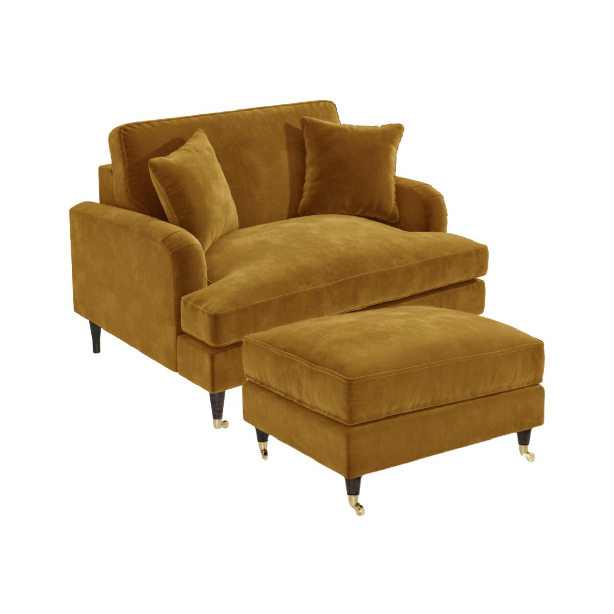 This bundle includes : Mustard Velvet Loveseat - Payton1 x Mustard Velvet Footstool - PaytonDimensions:H8. 5 x W120 x D96 cm Discover maximum comfort and minimum maintenance with this gorgeous loveseat and footstool bundle. The plush Payton loveseat offers traditional styling with a modern twist thanks to its dark wooden legs with gold accent front castors and classic ruched saddle arms. The loveseat and footstool are beautifully tailored and upholstered in mustard velvet, bringing a splash of colour to your living space. The loveseat comfortably seats two and comes accompanied with matching footstool as well as two throw cushions which add a final flourish of elegance. Adding these trend-setting pieces to your home is easy. There's minimum assembly; it's just a case of fixing the legs into position. Features: Beautifully upholstered in soft-to-touch velvet The mustard velvet finish brings a touch of luxury Modern silhouette with saddle arms and tailored piping Deep seating with two matching throw cushions Dark wood legs with gold coated front castors All cushions are filled with comfortable, spongey foam Removable cushion covers – use a damp cloth to clean Minimum assembly – just attach the legs