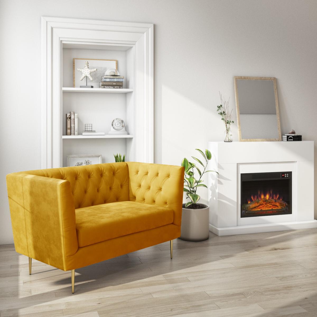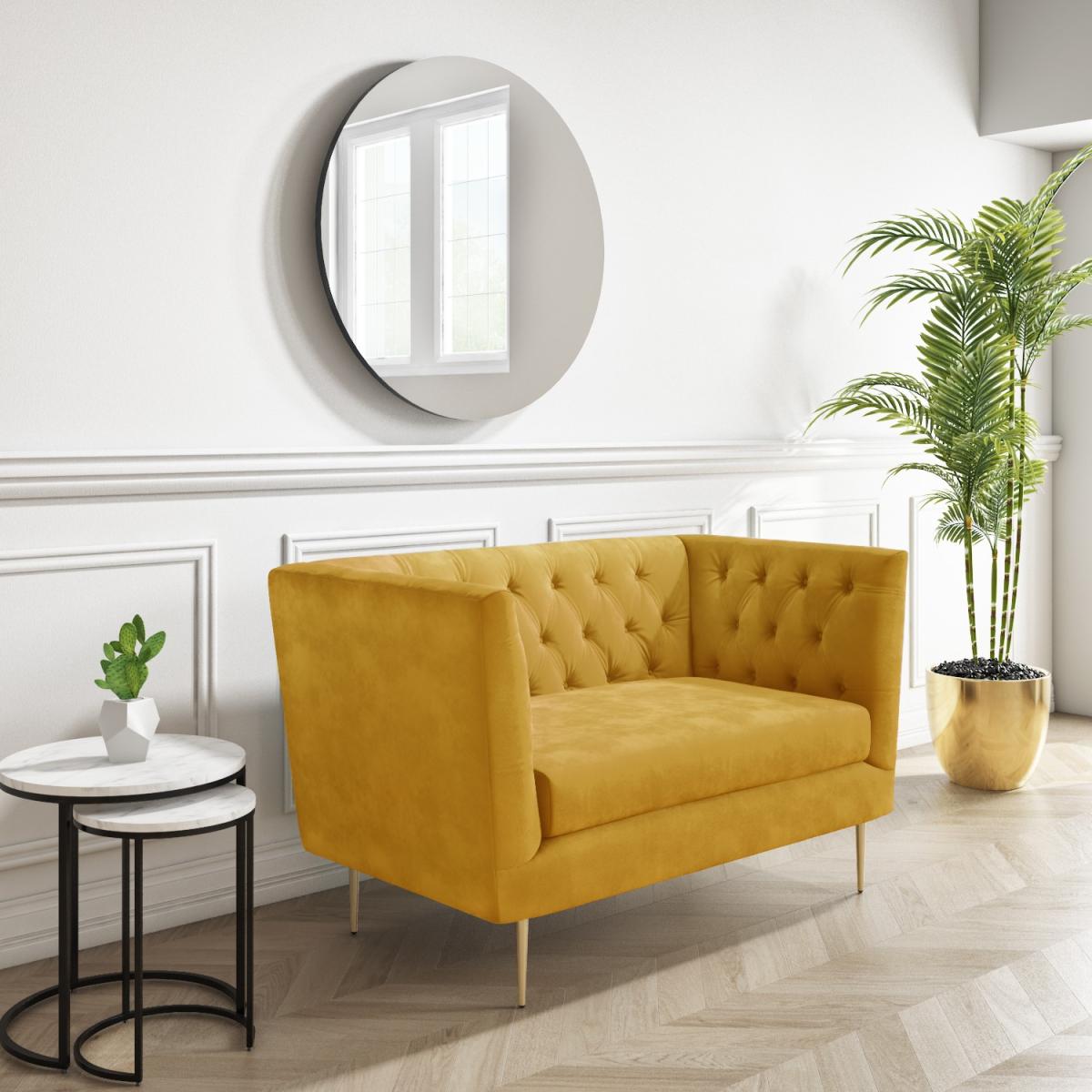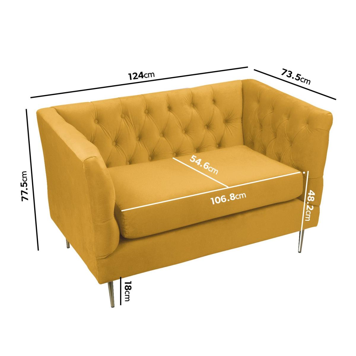 Features we love Liven up your living room with a vibrant pop of colour. Upholstered in luxurious soft-to-touch mustard velvet Exquisite deep button detailing and slim brass legs. Perfect for getting cosy with that special someone. Minimal assembly required just attach the legs. The Celeste love seat is also available in pink. Need to know. Dimensions. H77.5 x W124 x D73.5 cm Seats. 2 Colour. Mustard yellow Finish. Velvet upholstery and metal brass legs Material. Velvet fabric wooden frame and foam (UKFR) Weight. 28kg Assembly required. Yes - minimal..