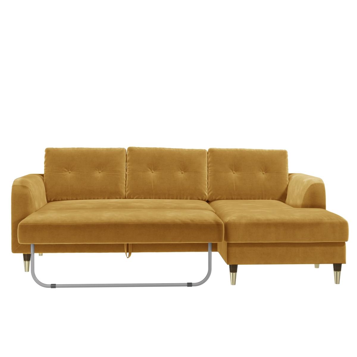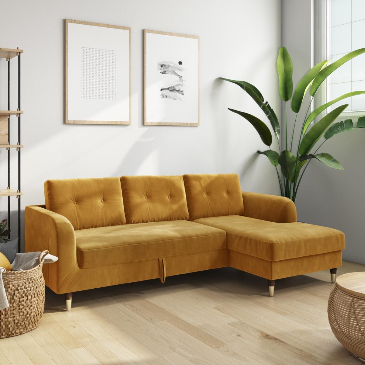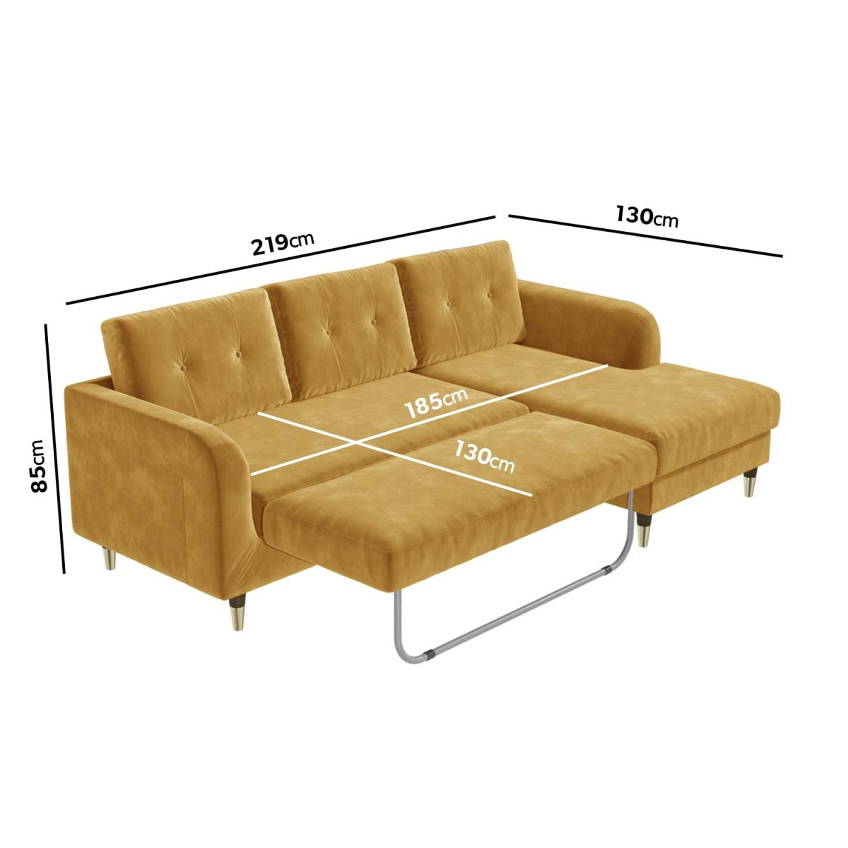 Features we love Velvet sofa bed with right-hand facing chaise lounge. Extend to 130cm wide with room for up to two guests. With stylish back button detailing and gold tipped legs. Super comfortable with a sprung base and foam fillingLift the seat pull out the bed and; legs down to set up All about me. Create an instant focal point with this stylish yet modern sofa bed. Upholstered in a vibrant mustard velvet with button detailing it's so eye-catching. Create extra lounging space by converting it to the bed; simply pull the tab to lift the seat pull out the bed and rest on the pull-out legs. It's perfect for last-minute sleepovers so you'll always be ready when guests call and stay overnight at a moment's notice. It's so versatile and you don't have to compromise on the appearance either. Also available with the chaise as left-hand facing and in other colourways. Need to know. Packaging dimensions. Box 1 W220 x D89 x H58 cm Packaging weights. Box 1 84kg Product dimensions. W219 x D130 x H85 cm Product weight. 76kg Colour. Mustard yellow Finish. Velvet upholstery and dark wood legs with gold tips Material. Velvet fabric with eucalyptus and plywood frame Maximum supported weight. 110kg (per seat) Filling. Spring and foam-filled Chaise lounge. Right-hand facing Assembly required. Yes.