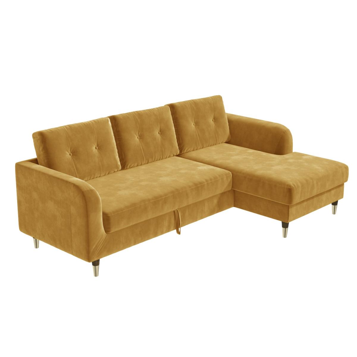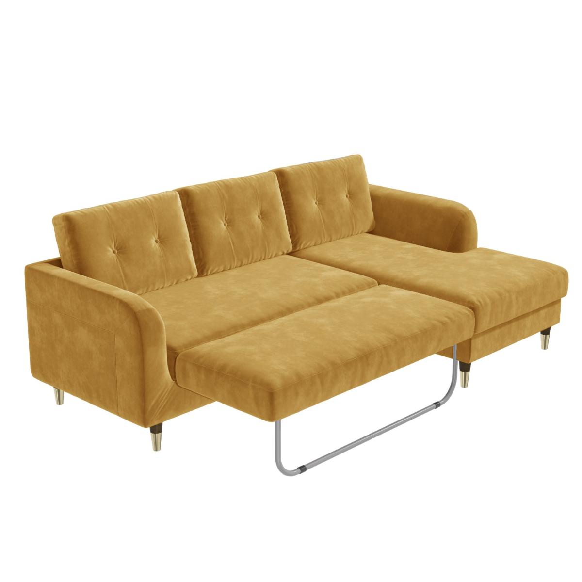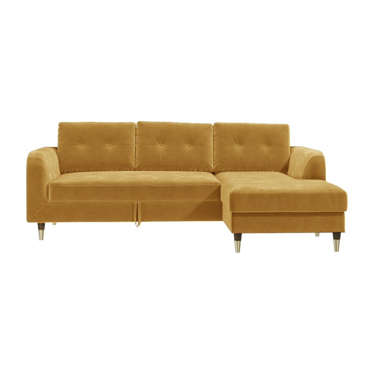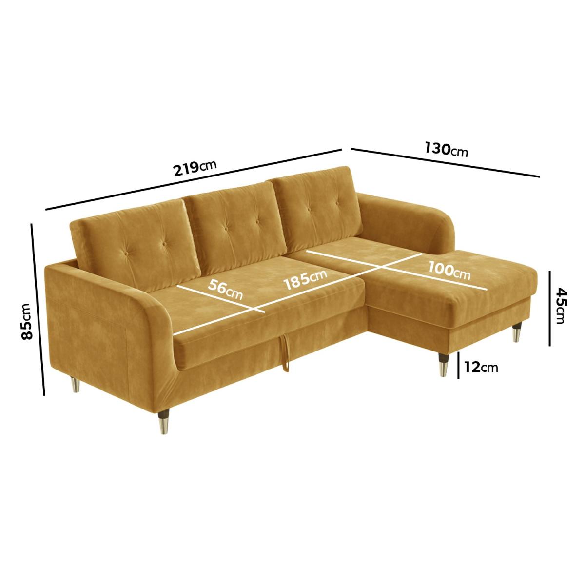 Features we love Velvet sofa bed with right-hand facing chaise lounge. Extend to 130cm wide with room for up to two guests. With stylish back button detailing and gold tipped legs. Super comfortable with a sprung base and foam fillingLift the seat pull out the bed and; legs down to set up All about me. Create an instant focal point with this stylish yet modern sofa bed. Upholstered in a vibrant mustard velvet with button detailing it's so eye-catching. Create extra lounging space by converting it to the bed; simply pull the tab to lift the seat pull out the bed and rest on the pull-out legs. It's perfect for last-minute sleepovers so you'll always be ready when guests call and stay overnight at a moment's notice. It's so versatile and you don't have to compromise on the appearance either. Also available with the chaise as left-hand facing and in other colourways. Need to know. Packaging dimensions. Box 1 W220 x D89 x H58 cm Packaging weights. Box 1 84kg Product dimensions. W219 x D130 x H85 cm Product weight. 76kg Colour. Mustard yellow Finish. Velvet upholstery and dark wood legs with gold tips Material. Velvet fabric with eucalyptus and plywood frame Maximum supported weight. 110kg (per seat) Filling. Spring and foam-filled Chaise lounge. Right-hand facing Assembly required. Yes.