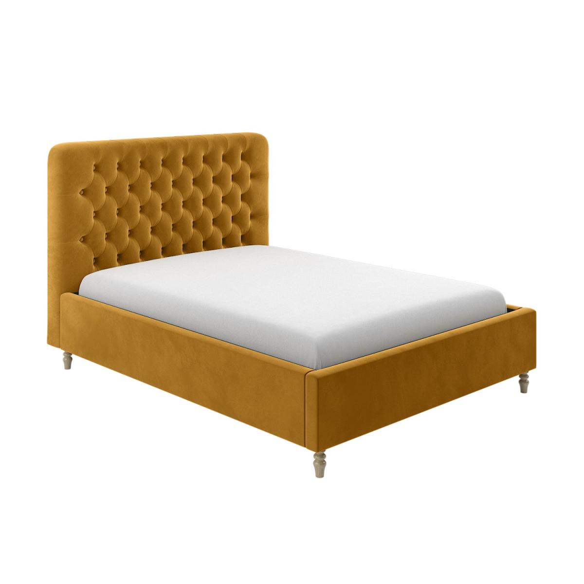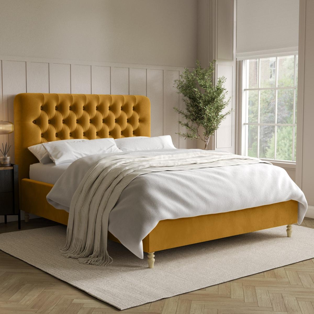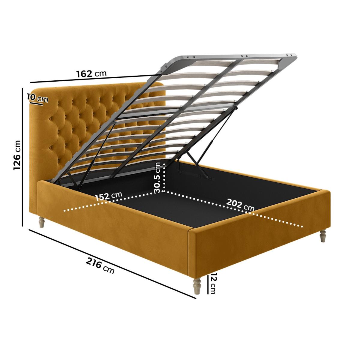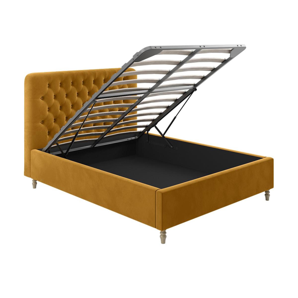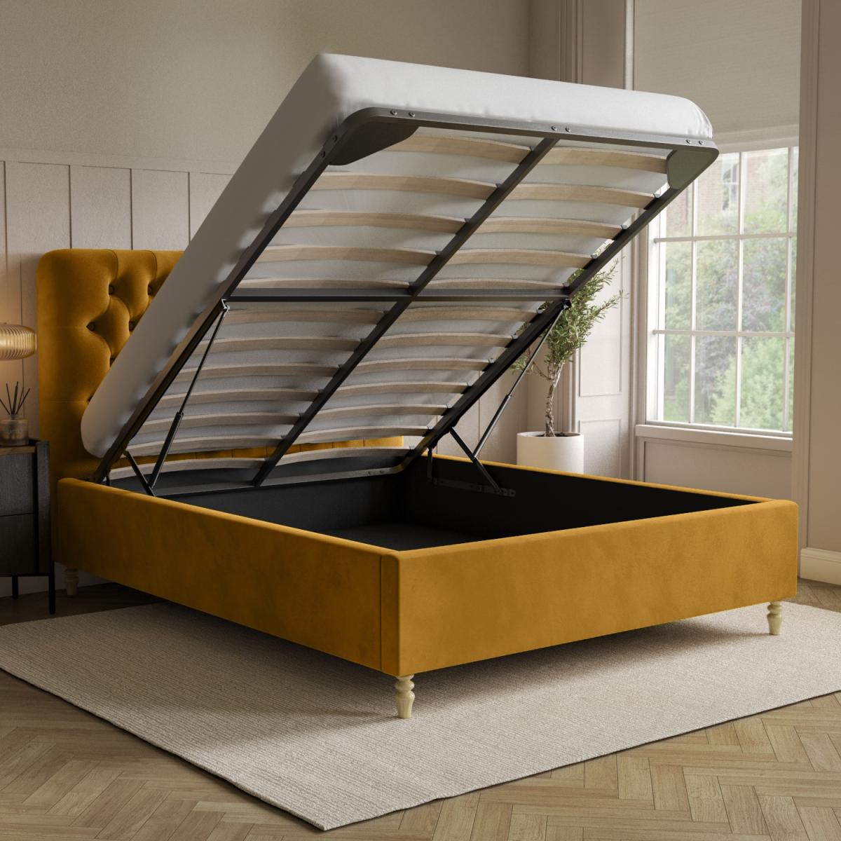 All about me Add a pop of colour to any modern bedroom with the Pippa ottoman bed in a stunning yellow colour, and the solid light wood turned legs add a traditional touch. The end-opening ottoman is easy to access, and the fabric-lined base protects your stored items. It features a sprung-slatted base for ultimate comfort, and fits a standard UK king size mattress. Need to know Dimensions: W162 x D216 x H126 cm Weight: 61 kg Mattress size: Standard UK King Size (5ft) Mattress included: No Gas lift supported weight: 75 kg Colour: Yellow Finish: Upholstered Material: Velvet fabric Bed base: Sprung-slatted Assembly required: Yes Packaging dimensions:Box 1- W166 x D130 x H15 cm, Box 2- W208 x D33 x H21.5 cm