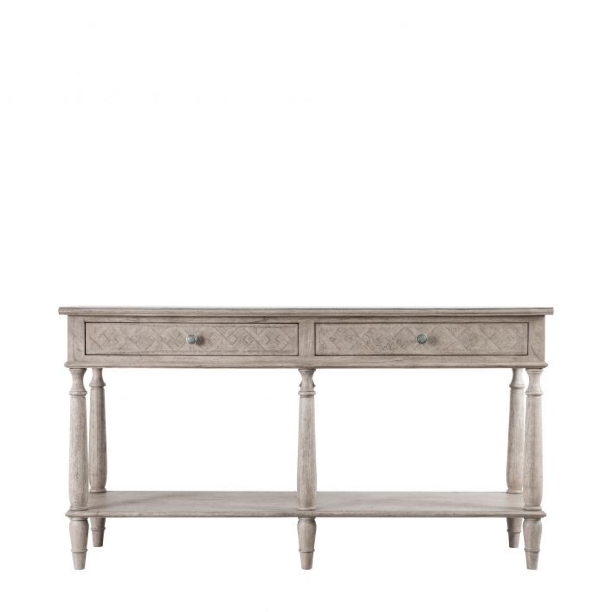 This collection offers a wide range of living, dining and bedroom furniture pieces, crafted from Mindy wood with a stunning inlaid parquet-style design. The lightly brushed finish recreates the natural ageing effect. With its classy design and subtle finish, it offers versatile style that would suit a wide range of interiors. This 2 drawer console table adds a sophisticated touch to a room. The drawer fronts and top feature the signature parquet-style design, whilst the elegantly shaped spindle legs and lower shelf add balance to create a beautifully proportioned design piece.