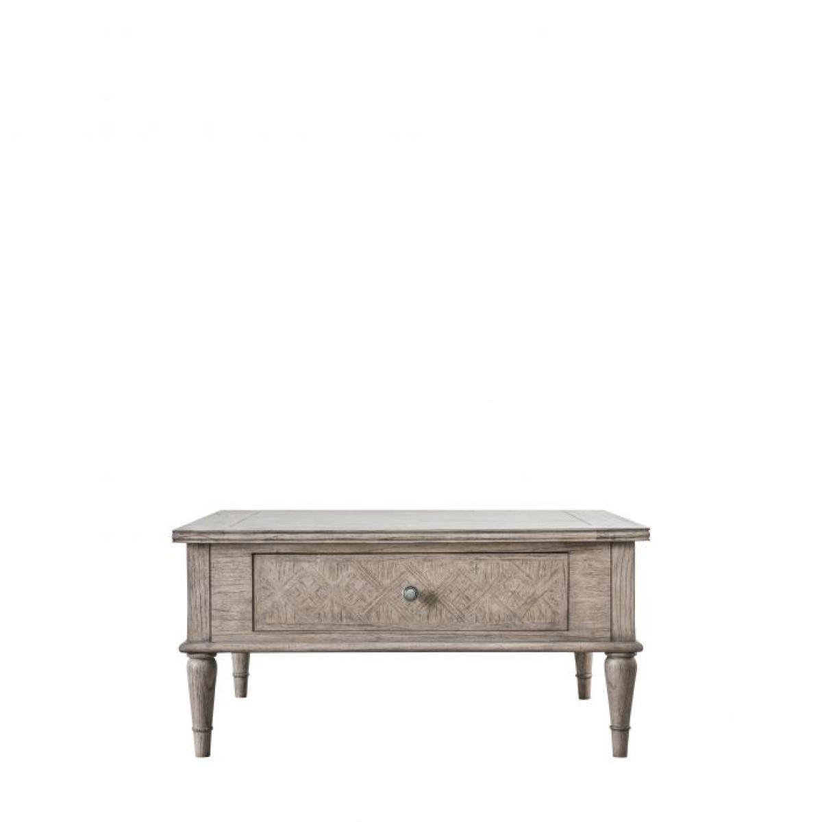 This collection offers a wide range of living, dining and bedroom furniture pieces, crafted from Mindy wood with a stunning inlaid parquet-style design. The lightly brushed finish recreates the natural ageing effect. With its classy design and subtle finish, it offers versatile style that would suit a wide range of interiors. This square 2 drawer coffee table adds practical style to a living room. The two drawers, one on either side of the table, are ideal for helping to keep tidy. The top and drawer fronts feature the signature parquet-style design, whilst elegant turned legs add a sophisticated finish to the table.
