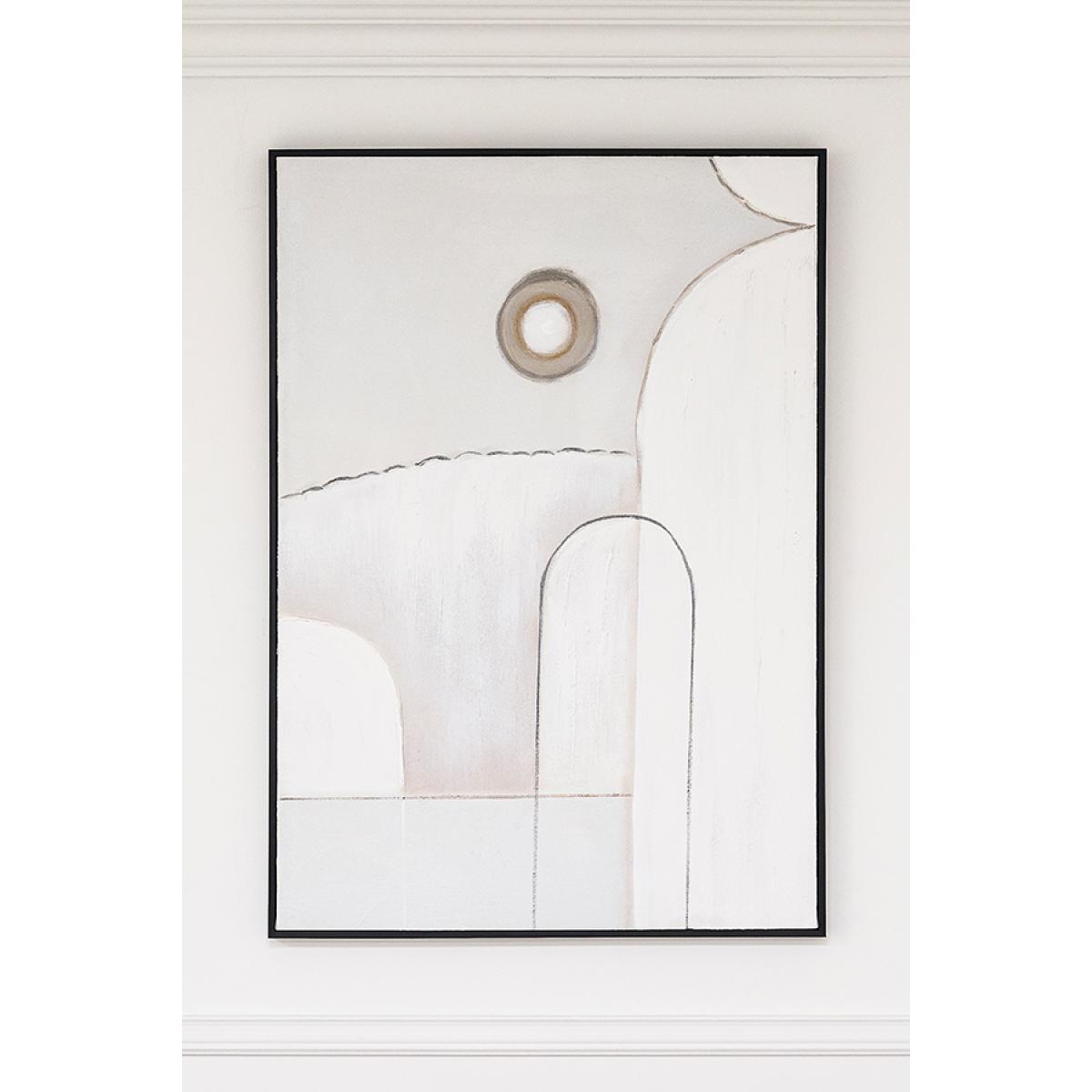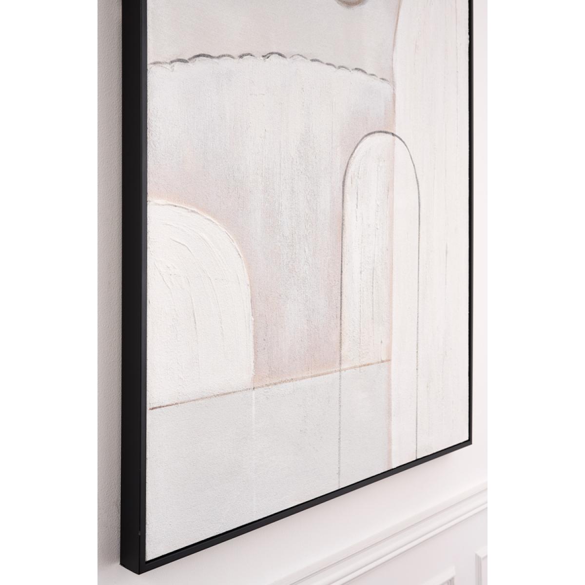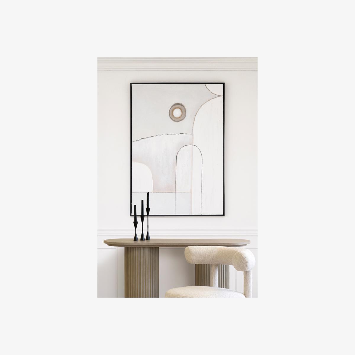 A high-quality, hand-painted artwork on stretched canvas - exclusive to My Furniture. A serene, contemporary, minimalism composition. Featuring overlapping forms and delicate textures in off-whites, taupe and stone, it will bring a calm and understated presence to any space. Finished in a deep, black-stained wooden frame. Supplied with fixings for both portrait or landscape hanging.