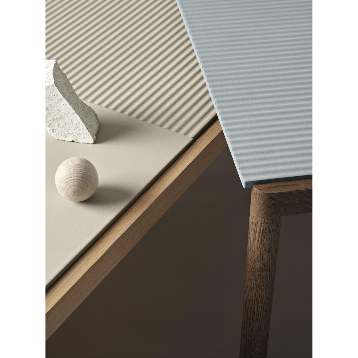 This little table is a great addition to both modern and Scandinavian-inspired interiors, thanks to its clean lines and contrasting materials. I love how the dark oiled oak legs add warmth and texture, while the pale blue top introduces a subtle colour that can soften a neutral palette or complement other muted tones. It works particularly well in open-plan living areas or beside a sofa, where it can serve as a versatile surface for books, drinks, or decorative objects. Practical styling tips include pairing it with colourful ceramics or layered textiles to add visual interest, or keeping an uncluttered look for a minimalist aesthetic. Its modest proportions also make it a flexible piece that won't dominate the room but will add a touch of understated elegance.