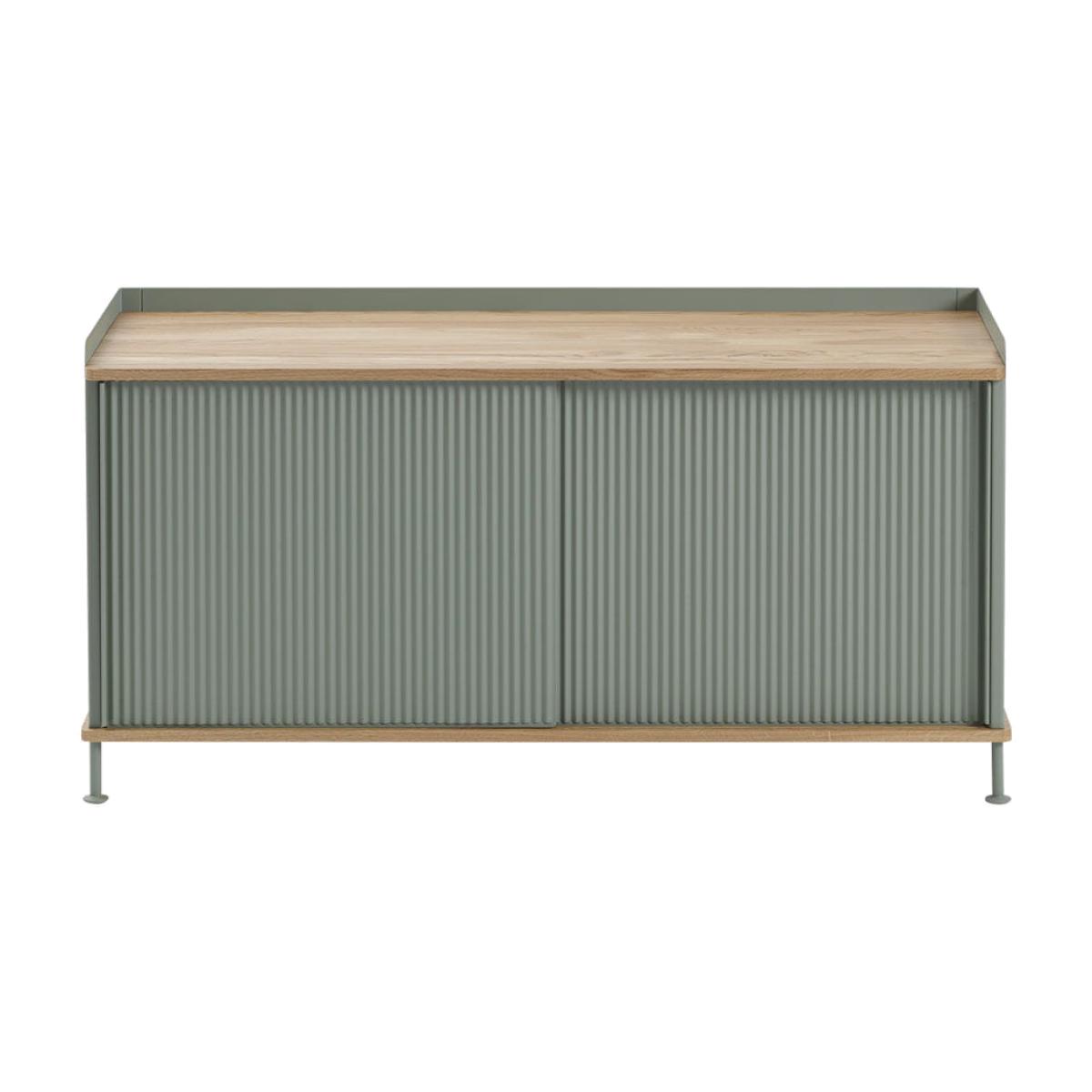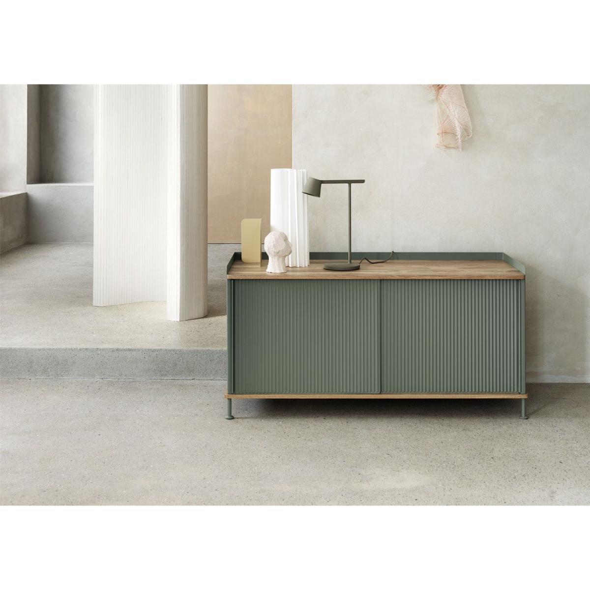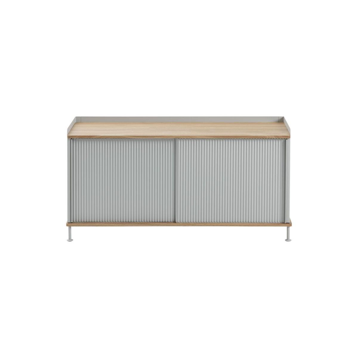 The Enfold Sideboard combines industrial materiality with residential references for a new perspective on modern storage. Made from a lacquered steel that gently enfolds its top and bottom in solid oak, the Enfold Sideboard fuses cold and warm materials for a unique expression, paired with the vibrantly modern expression of its ridged steel doors. The design comes in two sizes: one vertical and one horizontal, both with adjustable shelves to either side of its middle—the horizontal sideboard has one shelf to either side of its middle to be placed across five different levels while the vertical sideboard has one shelf to either side of its middle to be placed across three different levels. Both sizes have outlets for cables inside.