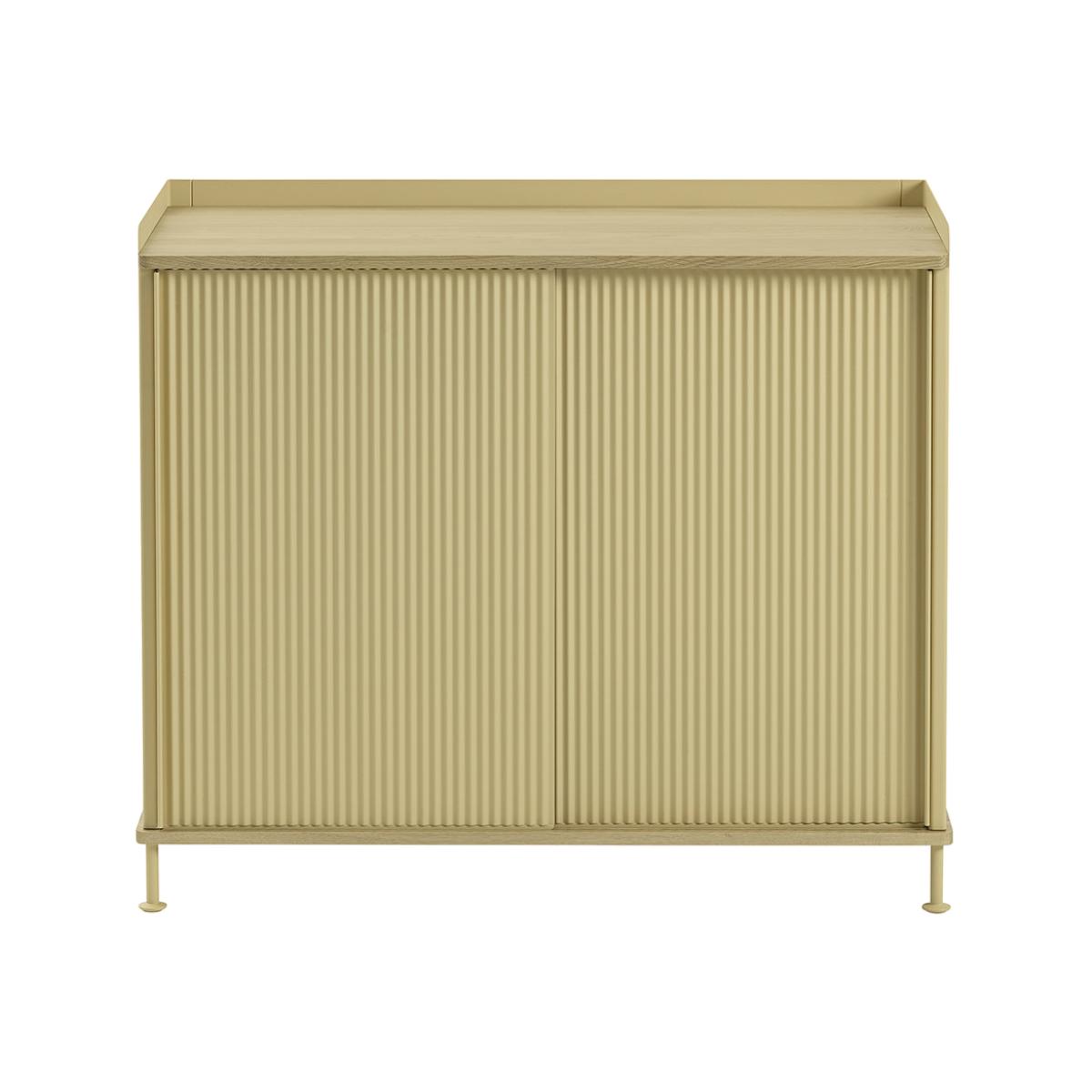 Bring chic Scandinavian style to the home with this Enfold sideboard from Muuto. Encased in smooth and bended lacquered steel, this sideboard has a sleek industrial feel and has been designed by Thomas Bentzen. Finished with a top and base of solid oak, it has sliding doors which open to reveal a single shelf which can be placed across three different levels. Key features: * Sideboard * Material: oak, lacquered steel * Dimensions: H84xW99.5xD45cm * Designed by Thomas Bentzen * Industrial inspired design * Solid oak top and base * Enrobed with smooth lacquered steel * Sliding doors in bended lacquered steel * In a pale yellow shade