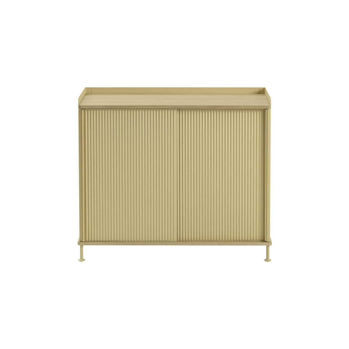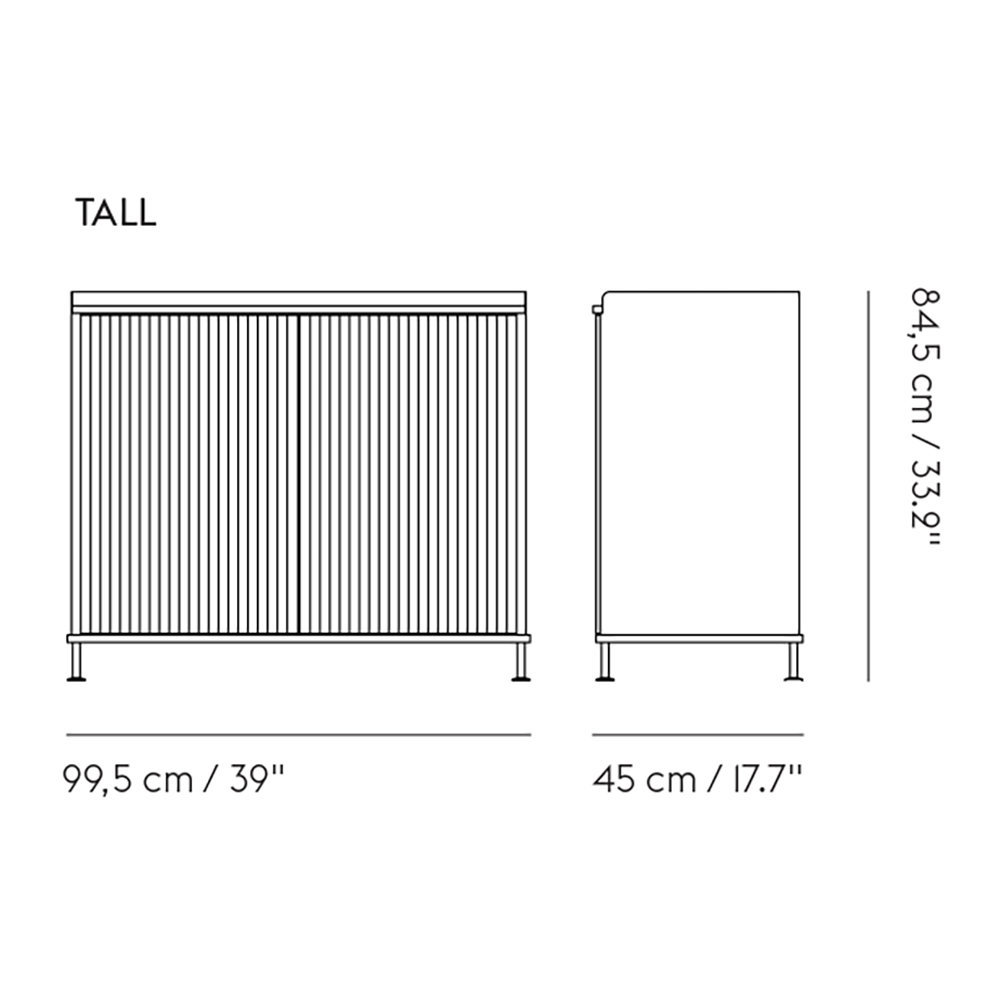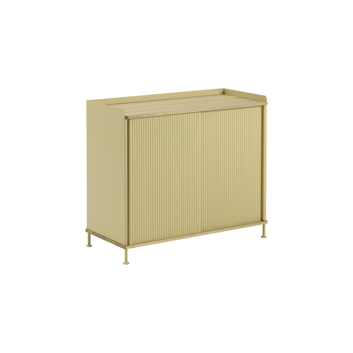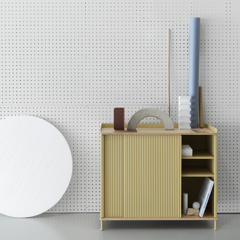 Bring chic Scandinavian style to the home with this Enfold sideboard from Muuto. Encased in smooth and bended lacquered steel, this sideboard has a sleek industrial feel and has been designed by Thomas Bentzen. Finished with a top and base of solid oak, it has sliding doors which open to reveal a single shelf which can be placed across three different levels.