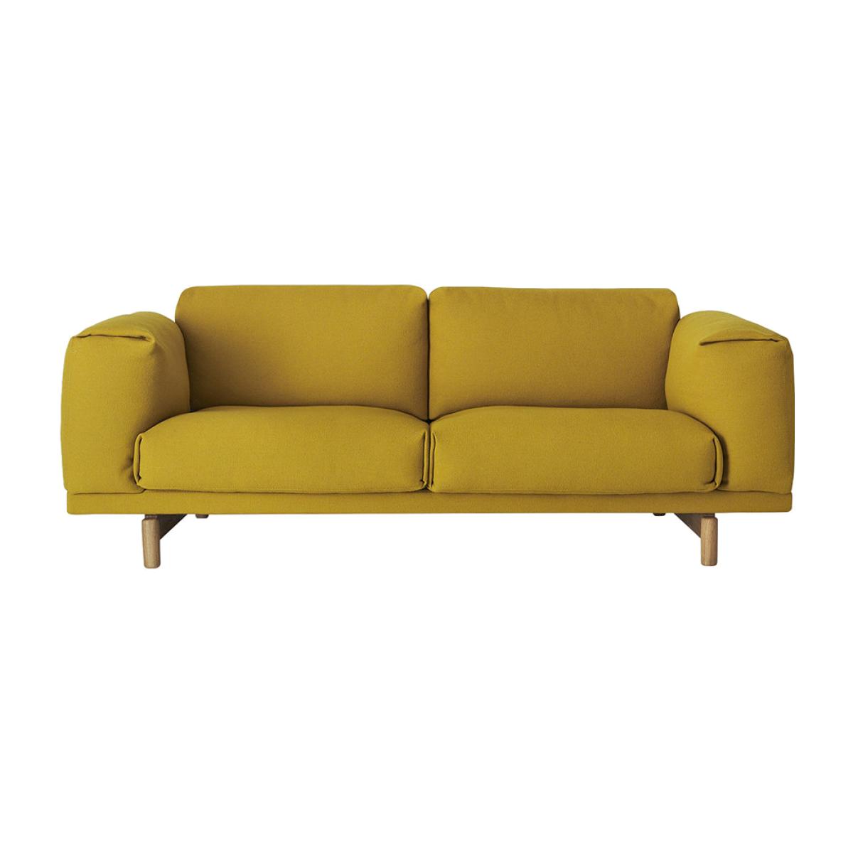 Bring some style to your seating with this Rest sofa from Muuto. The perfect spot for two, this sofa is a curvaceous take on a classic sofa shape that you'll love to sink into. Designed by Anderssen & Voll, it's finished with sturdy oak legs. Key features: * 2 seater sofa * Frame composition: steel, wood * Filling composition: cold foam, feathers * Upholstery composition: 70% new wool, 30% viscose * Dimensions: H72xW200xD92cm * Designed by Anderssen & Voll * Curvaceous interpretation of a classic shape * In vibrant yellow * Natural oak legs