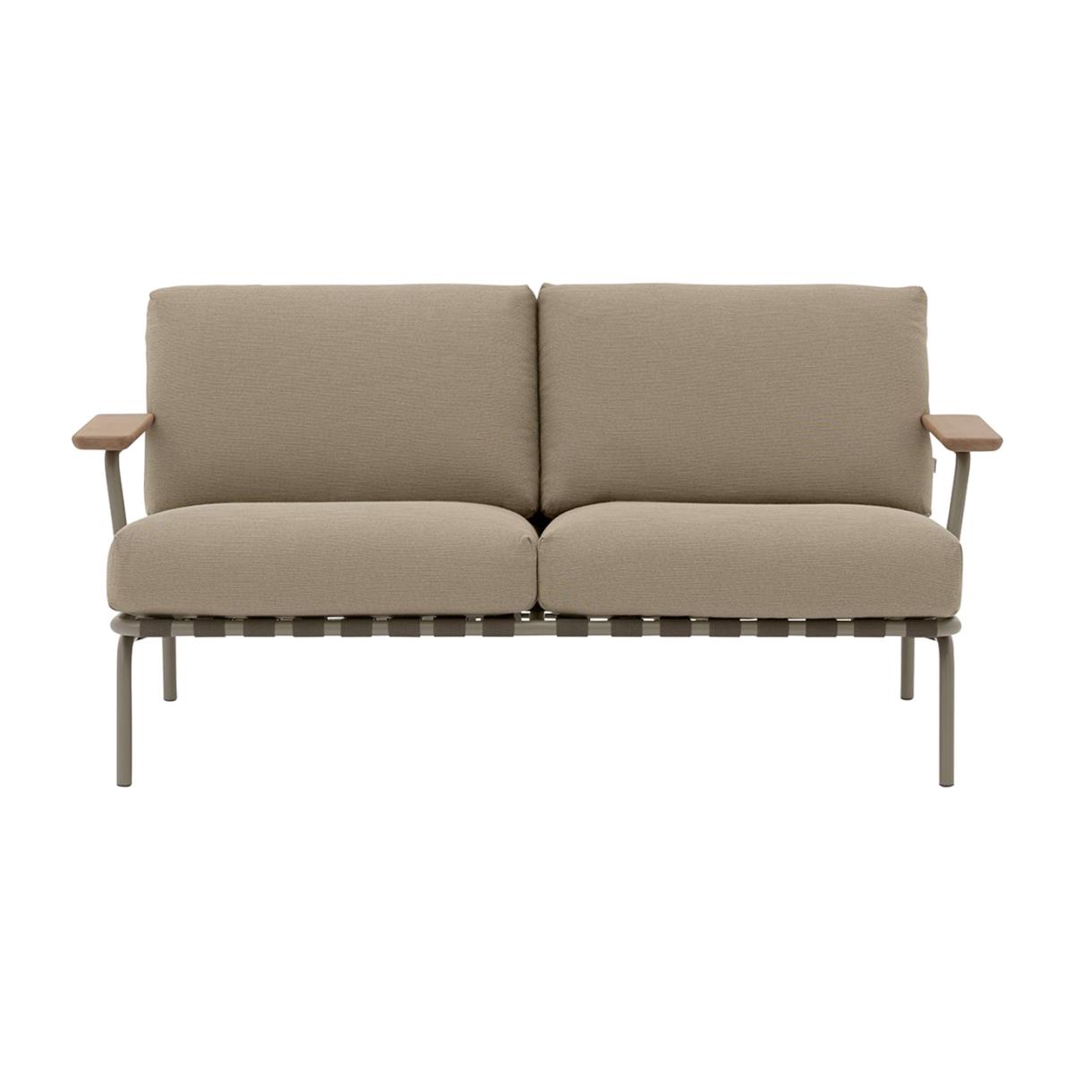 The Settle Outdoor 2 Seater Sofa invites you to settle into its comfort, offering an ideal setting for enjoying the outdoors all day. Its airy steel frame—complete with visible belts and intricate details—enhances its visual allure from every angle, while mahogany armrests add a warm, tactile feel. The galvanized, primed, and powder-coated steel frame ensures corrosion resistance for long-lasting use. Plush cushions made with quick-dry foam and durable outdoor textiles provide fast-drying resilience in rain and year-round durability when paired with an outdoor cover.