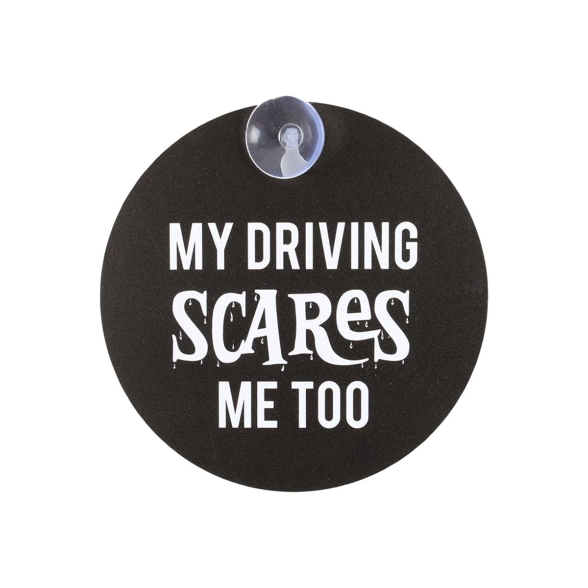 Lighten the mood out on the road with this fun window sign which reads 'My driving scares me, too'. Perfect for letting your dark sense of humor shine through on the daily commute.