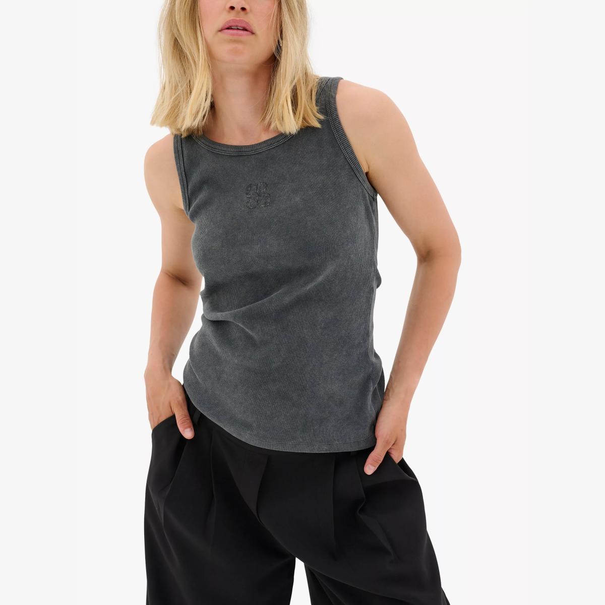 The Mandy tank top is a cool and simple top, that you can style in endless ways. It is sleeveless with a round neck, and it is made in a soft and stretchy rib jersey. The tank top is cut at the hips and has embroidery at the front.