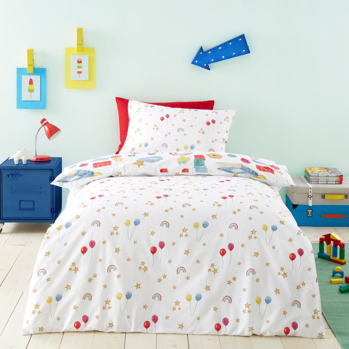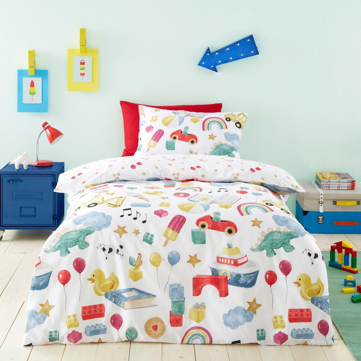 I love this duvet cover and pillowcase set for its vibrant, playful design, perfect for creating a cheerful and inviting child's bedroom. The mix of green, yellow, and white works well in lively, modern interiors or pastel-themed rooms, adding colour without overwhelming the space. It's especially suited to schemes that embrace fun patterns and pops of colour. For styling tips, pair it with plain, light-coloured bedding and a few colourful accessories to keep the look fresh and balanced. Incorporating simple storage solutions and soft furnishings in complementary tones will help create a cosy, organised environment. This set's 100% cotton fabric also makes it practical for everyday use, providing comfort and durability that parents will appreciate.