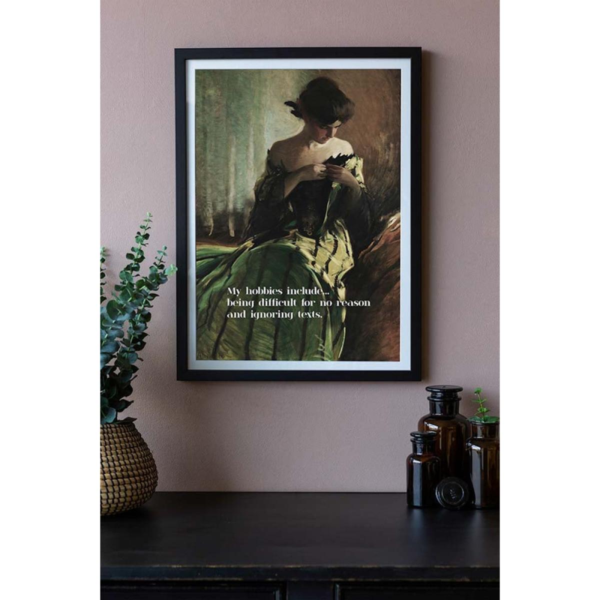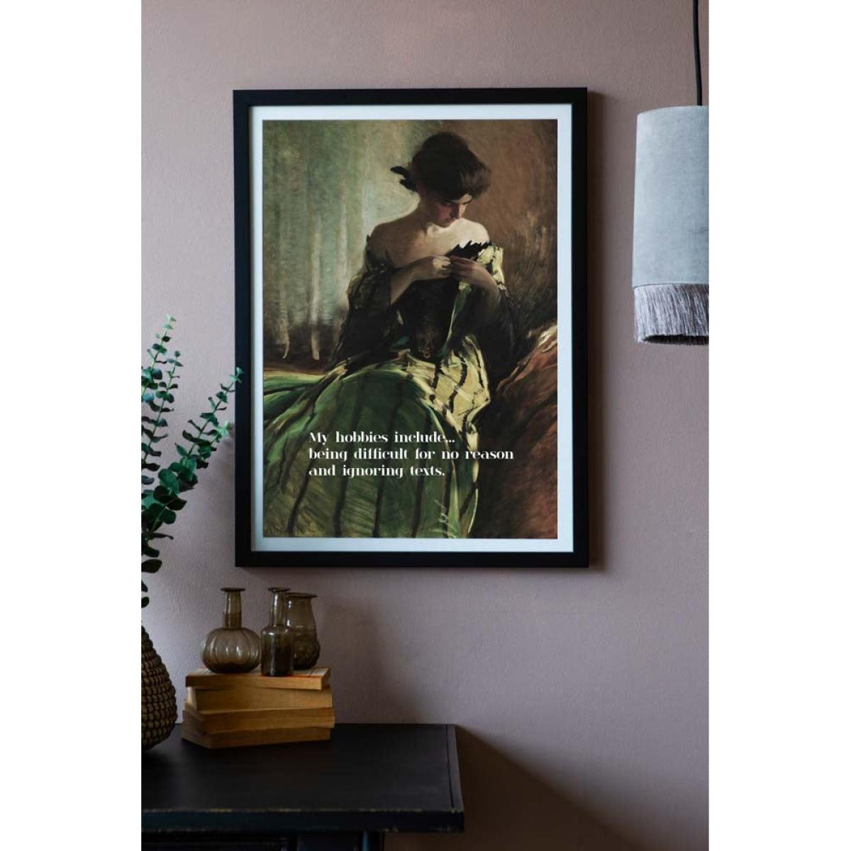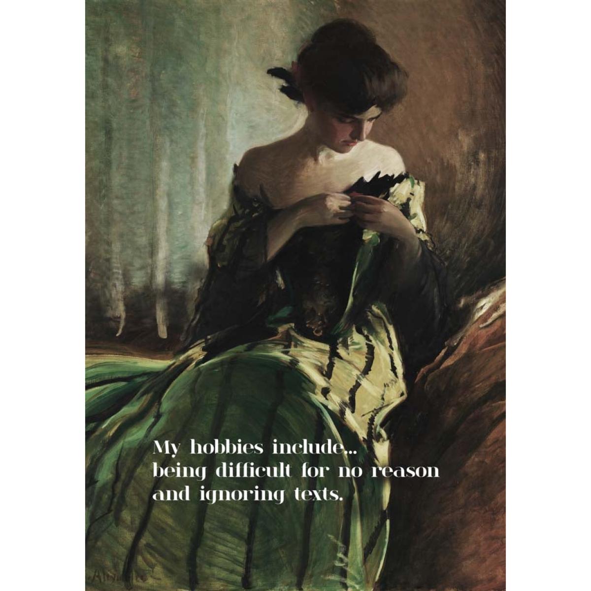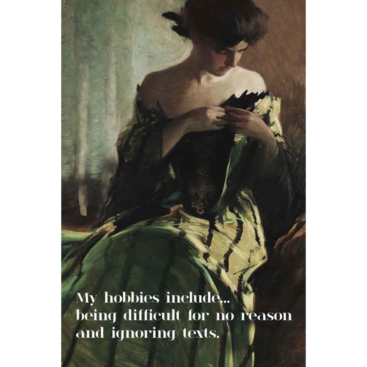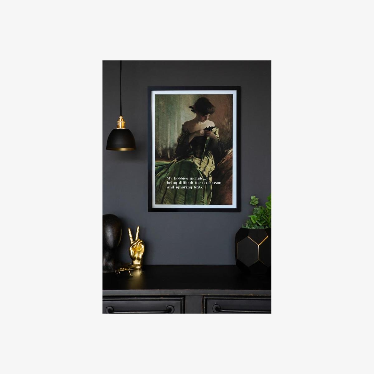 About The My Hobbies Classical Art Print ‘My hobbies include… being difficult for no reason and ignoring texts’… you go girl! Full of fun this classic portrait print of an elegant lady of leisure has a comical typography twist that we think will never fail to put a smile on your face. A Rockett St George Own-Brand Art Poster Print, the Traditional Lady Typography Poster Print comes as unframed or framed wall art, is printed on 220g paper and measures 42cm in width x 60cm in height. Why We Think You Will Love The Traditional Lady Art Print Over the years we’ve noticed that our quirky and humorous pieces never fail to go down well with you and so we wanted to expand our range and bring you a collection of traditional art prints with a typography twist that you can’t find anywhere else. We’ve said it before, but humour and wit in interiors really is integral for creating a home that is bursting with unique personality and so we think that these posters will be loved by anyone who wants to create a home that is incredibly individual and full of laughter and most importantly, fun! We also think that the ‘My hobbies include… being difficult for no reason and ignoring texts.’ Typography Art Print would make a fun and imaginative gift idea for that friend who never texts back or anyone that loves a good laugh. How to Display Your Traditional Lady Of Stature With A Typography Twist Art Print With a choice of four designs, you can choose from the My Hobbies Art Print,Too Magical Art Print, Half Arse Art Print and the Yes Sir I Can Boogie Art Print for your walls or alternatively create a picture wall with the prints for an added dash of magic. If you want to create a picture wall with this traditional style art print with a quirky twist, then we recommend arranging your prints into formation on your floors. That way you can visualise what it would look like on your walls without hammering unnecessary nails into your walls.