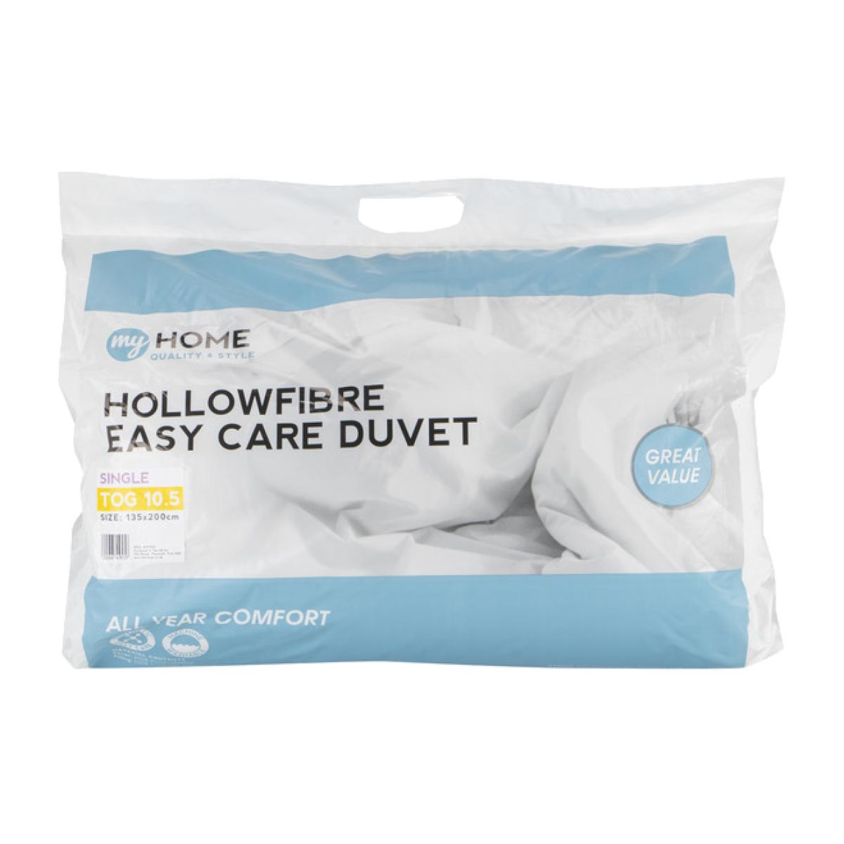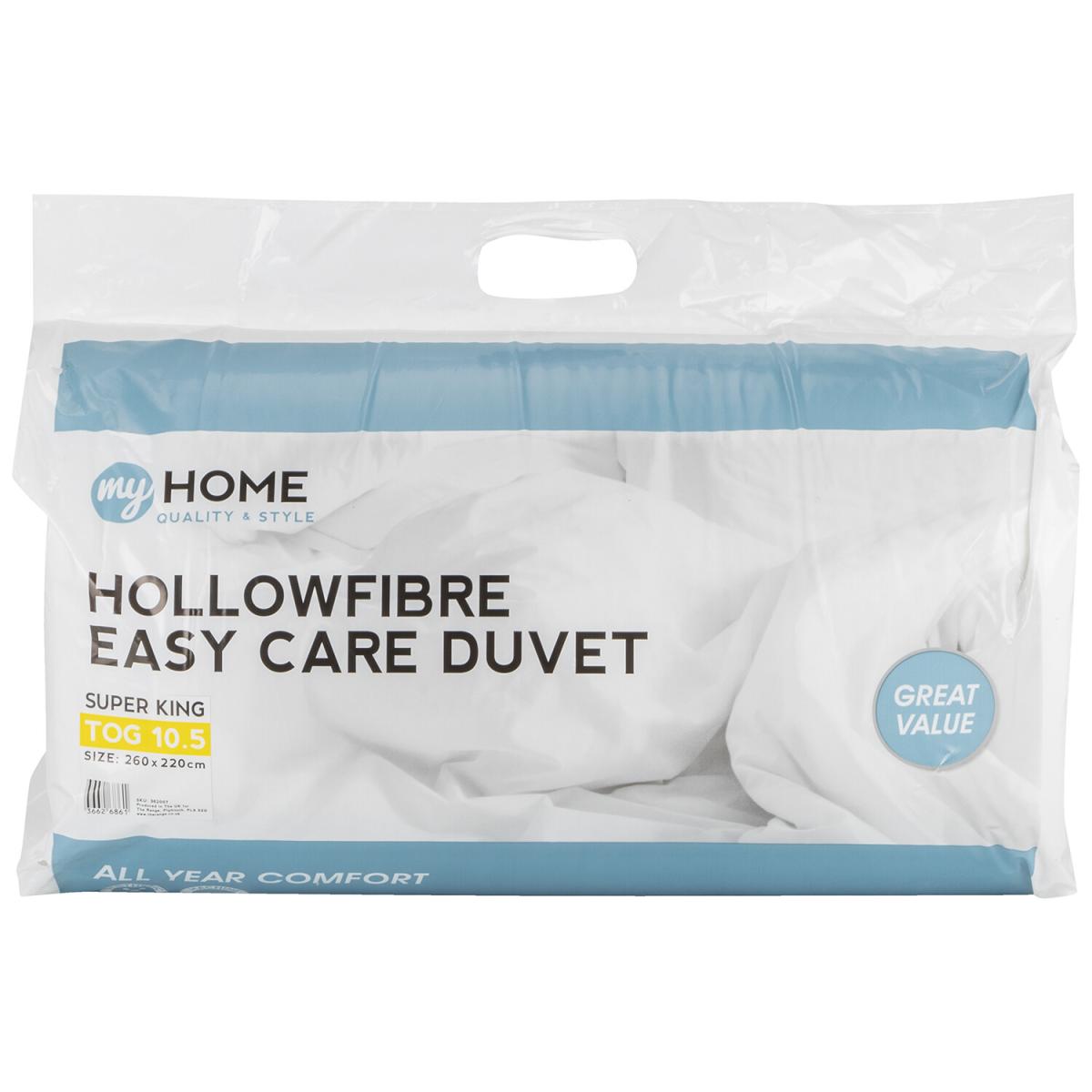 This great My Home 10.5 Tog Duvet has a well-balanced construction and polyester hollow fibre filling that provides warmth whilst preventing you from overheating. Its 10.5tog thickness makes it ideal for use all year, keeping you cosy and helping you to sleep easy, with the added ease of being machine washable.
