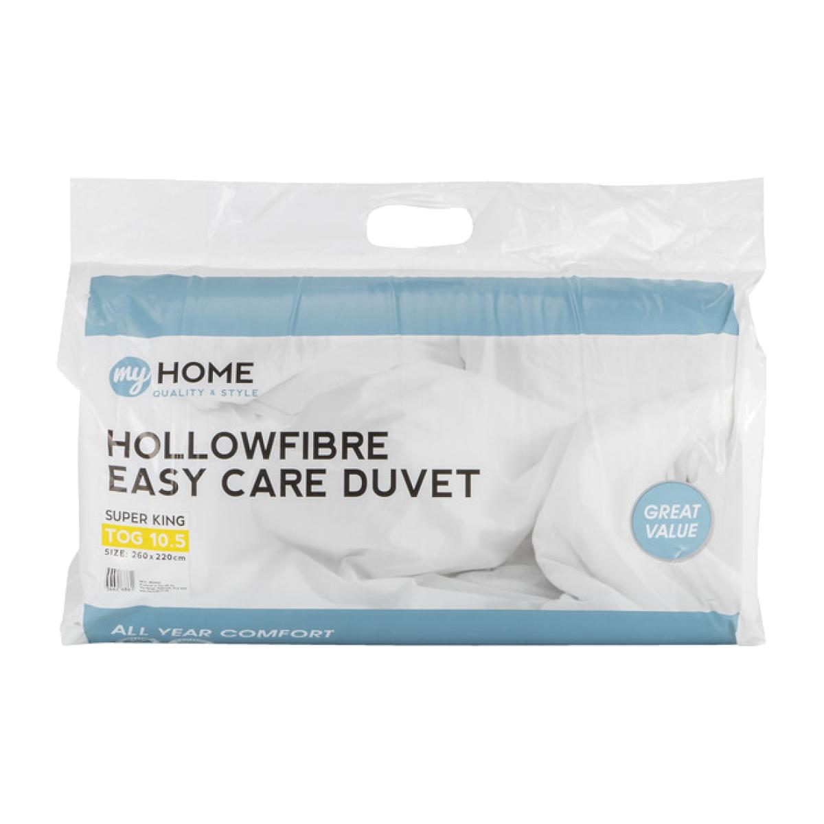 This great My Home 10.5 Tog Duvet has a well-balanced construction and polyester hollow fibre filling that provides warmth whilst preventing you from overheating. Its 10.5tog thickness makes it ideal for use all year, keeping you cosy and helping you to sleep easy, with the added ease of being machine washable.