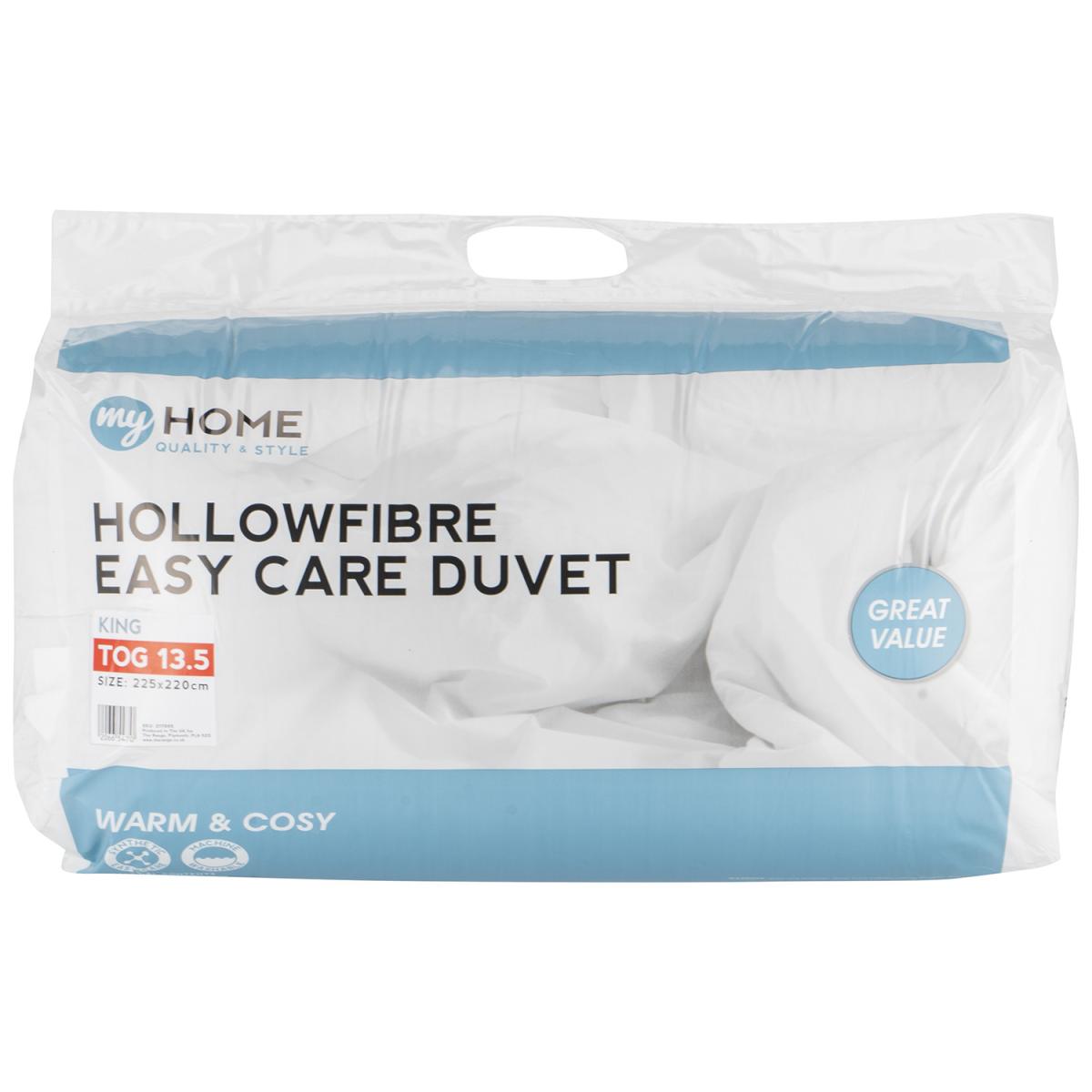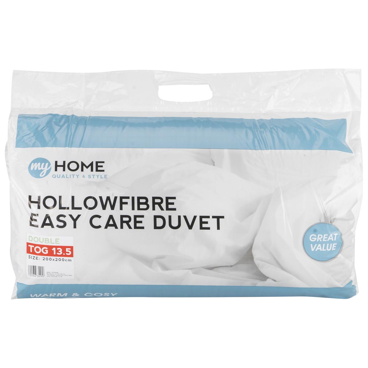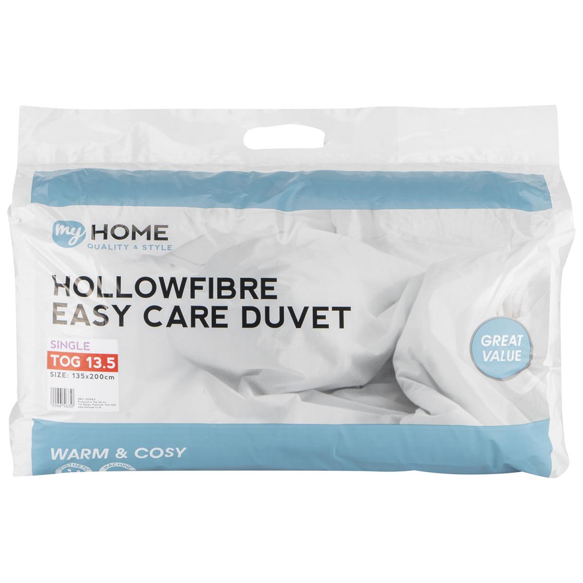 This cosy My Home 13.5 Tog Duvet will keep you warm and comfortable on those frosty nights. Its thick hollowfibre filling traps in heat, offering you a snuggly and serene sleep, and is machine washable for use night after night.