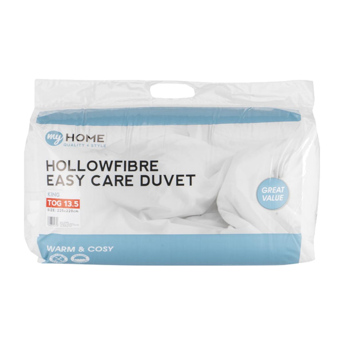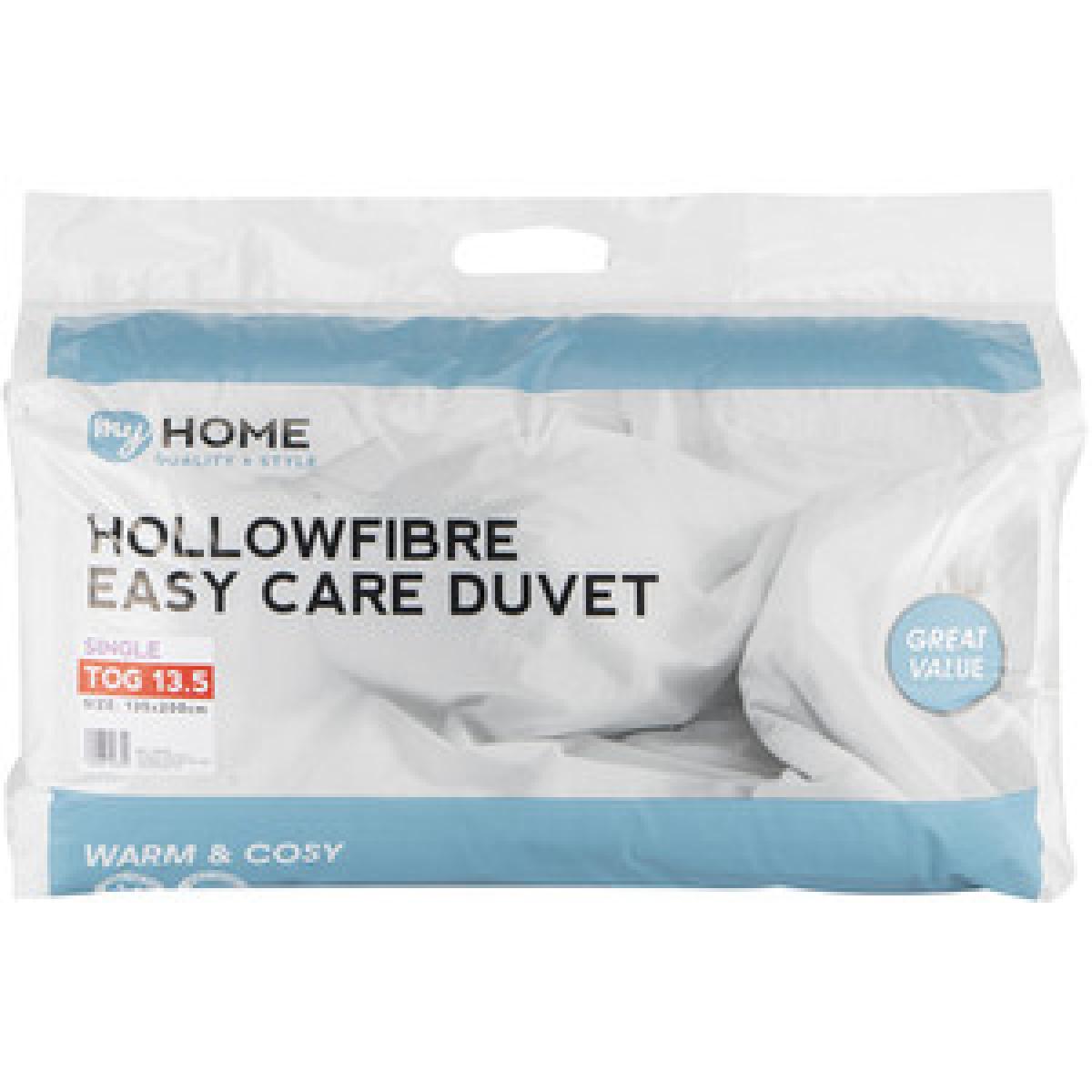 This cosy My Home 13.5 Tog Duvet will keep you warm and comfortable on those frosty nights. Its thick hollowfibre filling traps in heat, offering you a snuggly and serene sleep, and is machine washable for use night after night.