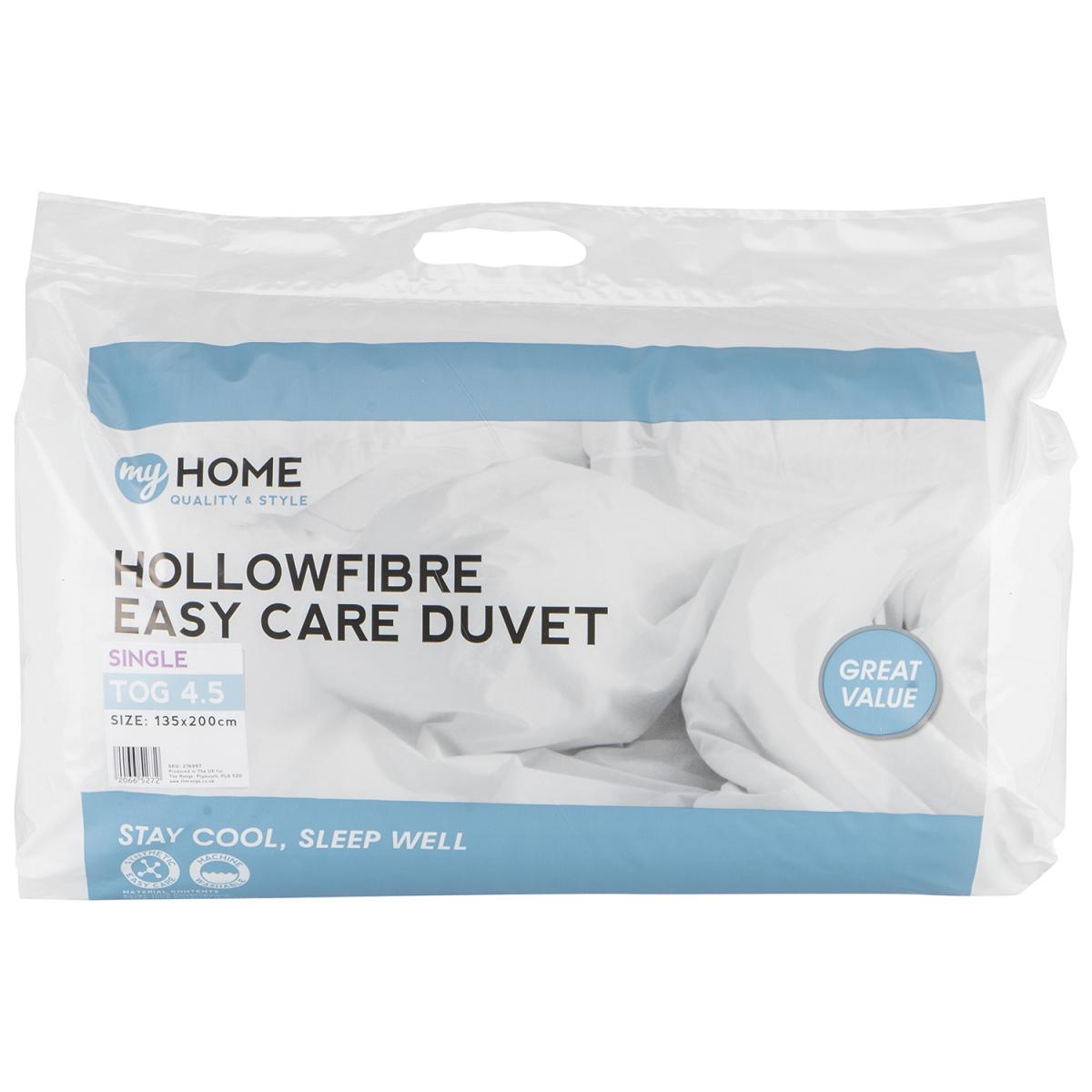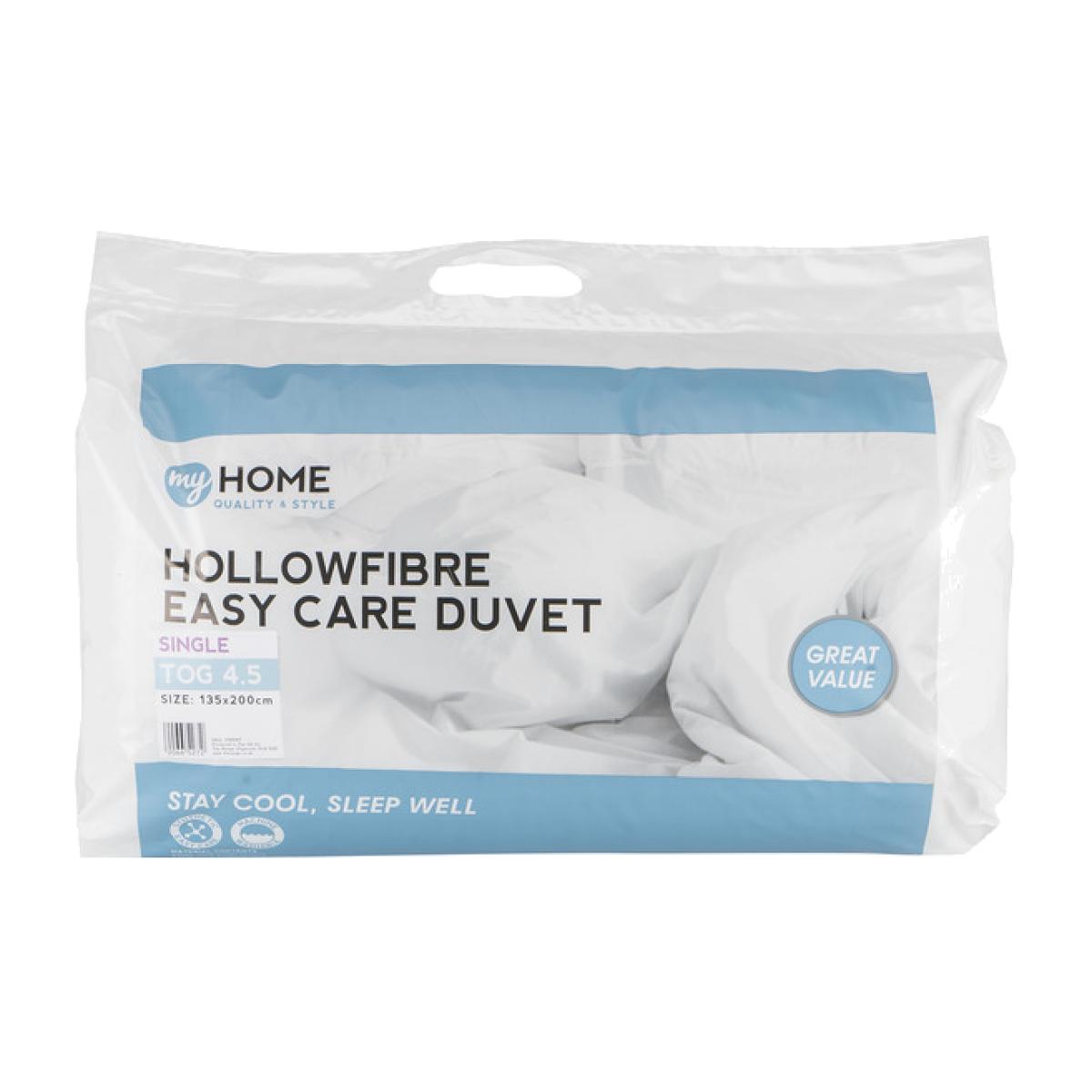 This great My Home 4.5 tog Duvet will keep you cool and have you sleeping easy through the slightly warmer months. Its light construction and polyester hollow fibre filling keeps you from overheating and helps to maintain the duvets plump and cosy feeling for a comfy snooze every night.