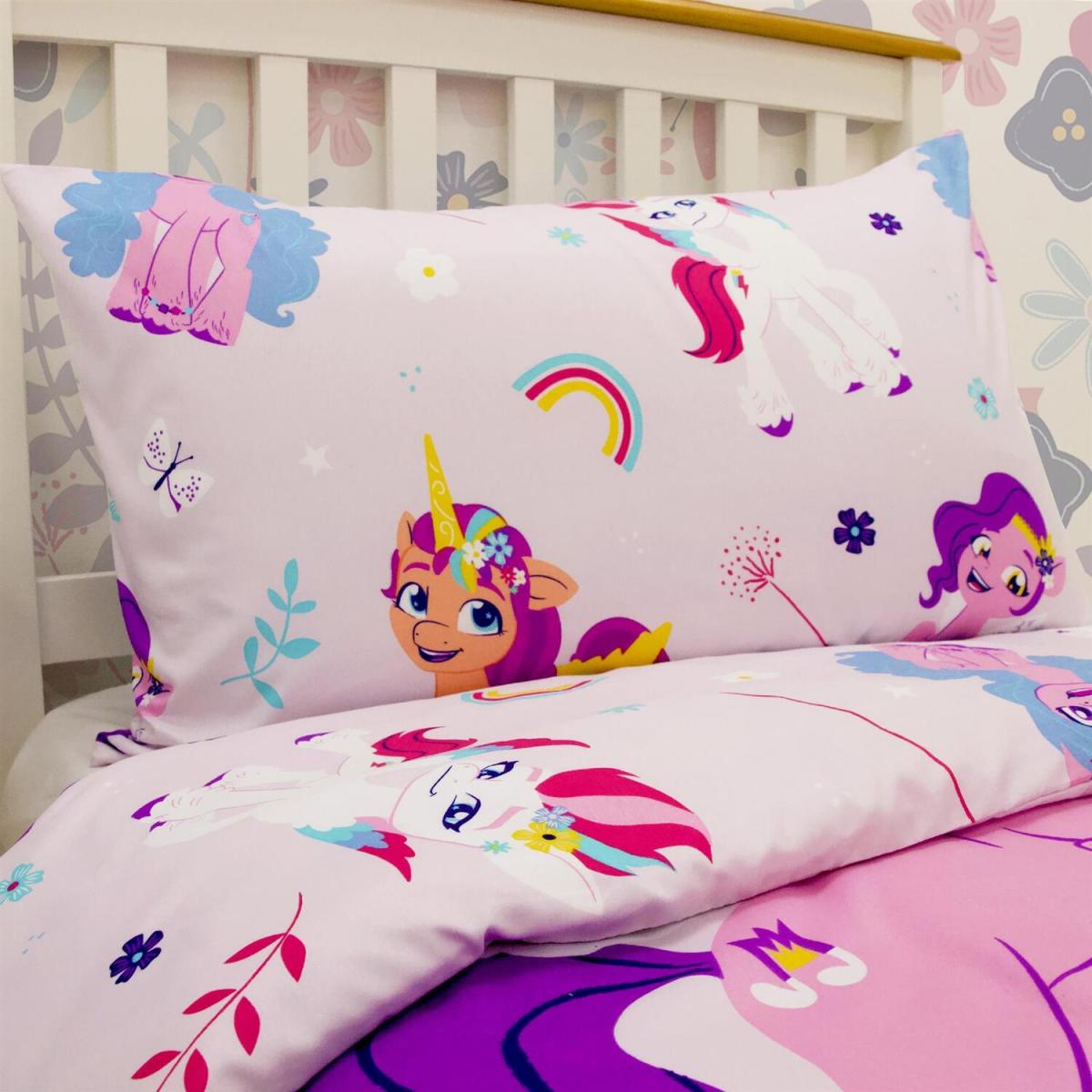 Now your little pony fan can follow the Mane 5 into dreamland with this magical My Little Pony single duvet set. This reversible set features a repeating My Little Pony pattern. This set is perfect for your little pony fanatic. The bedding set comes complete with matching pillow case(s). This duvet set is made from 100 polyester allowing for ultimate comfort and durability ensuring the best night's sleep for your little ones.