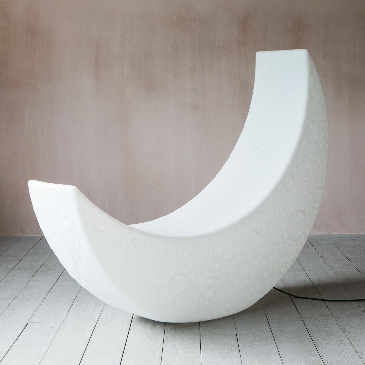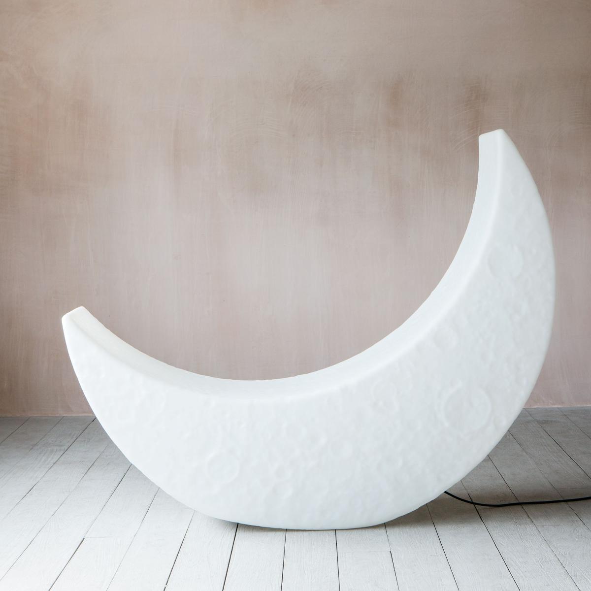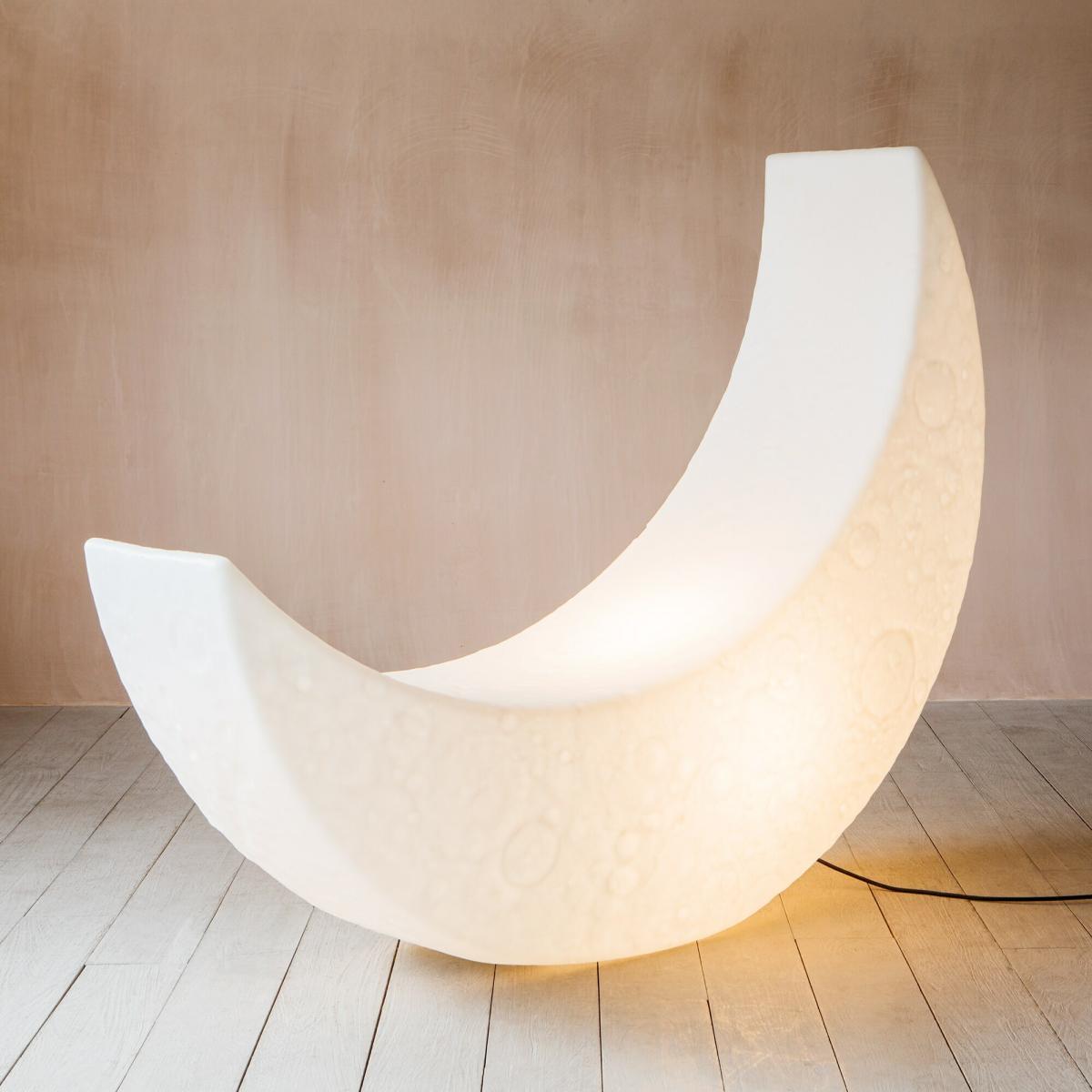 A show-stopping oversized crescent moon that is both an occasional chair and a floor lamp. This moon floor light will glow in the garden or be the perfect giant night light for a bedroom.