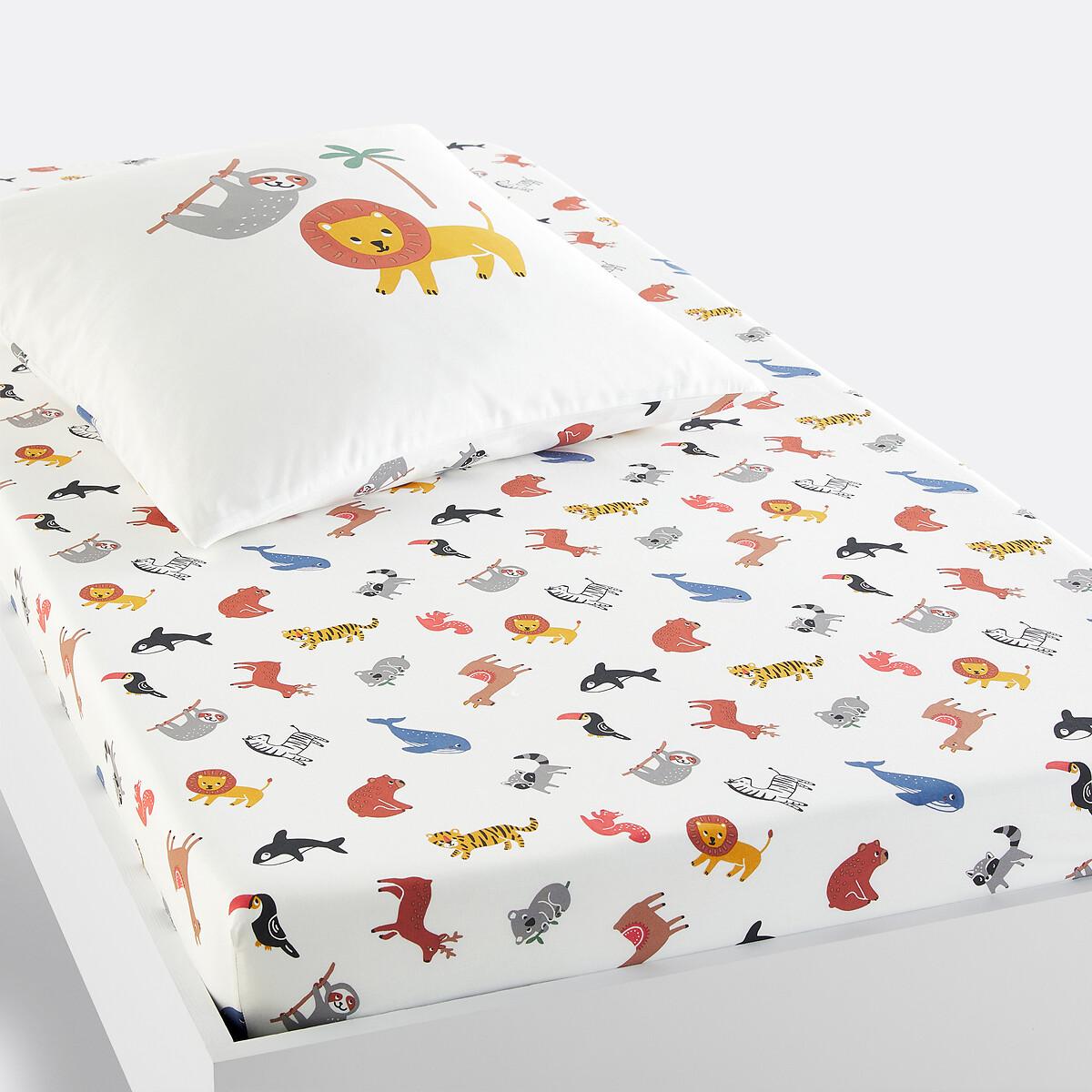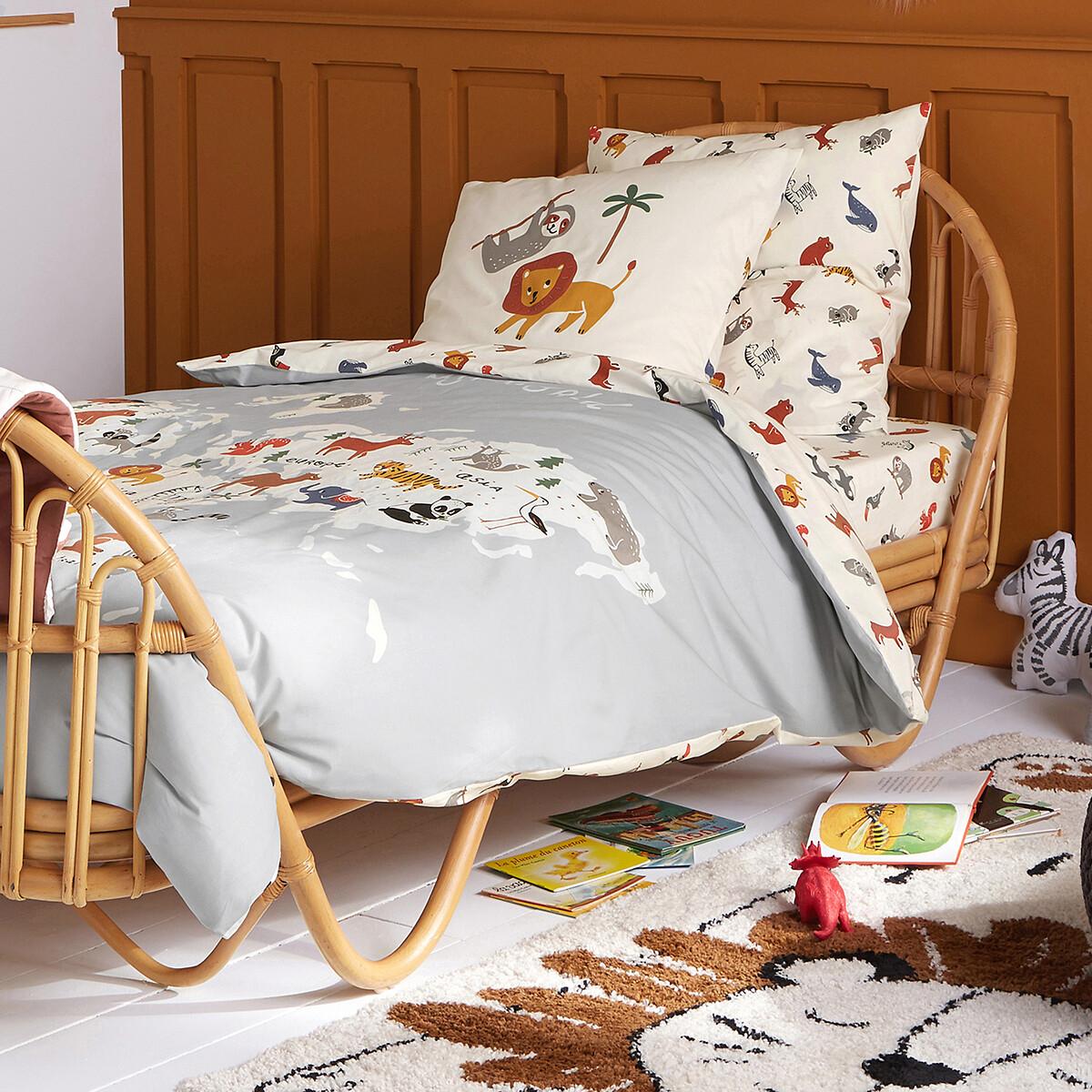With the My World fitted sheet in organic cotton, your child will want to go on an adventure and find out where lions, monkeys, whales... come from. Cotton is part of our daily lives. We love it for its suppleness and softness. Easy Care, it is ideal for the beds of young and old alike!Product Details • 100% cotton • Organic cotton • 144 thread count • For mattress height 25cm • Small printed pattern. Care Advice • Machine washable at 60°C • By washing your laundry at 40°C instead of 60°C, you limit energy consumption. Sizes • 90 x 140cm: Adjustable bed • 90 x 190cm: Single • Cotton from organic farming. Organic farming does not use any chemicals, pesticides, insecticides or GMOs. Produced with minimal impact on biodiversity. • OEKO-TEX® Standard 100. Standard 100 certification by OEKO-TEX® tests textile products for harmful substances via an independent, international label.