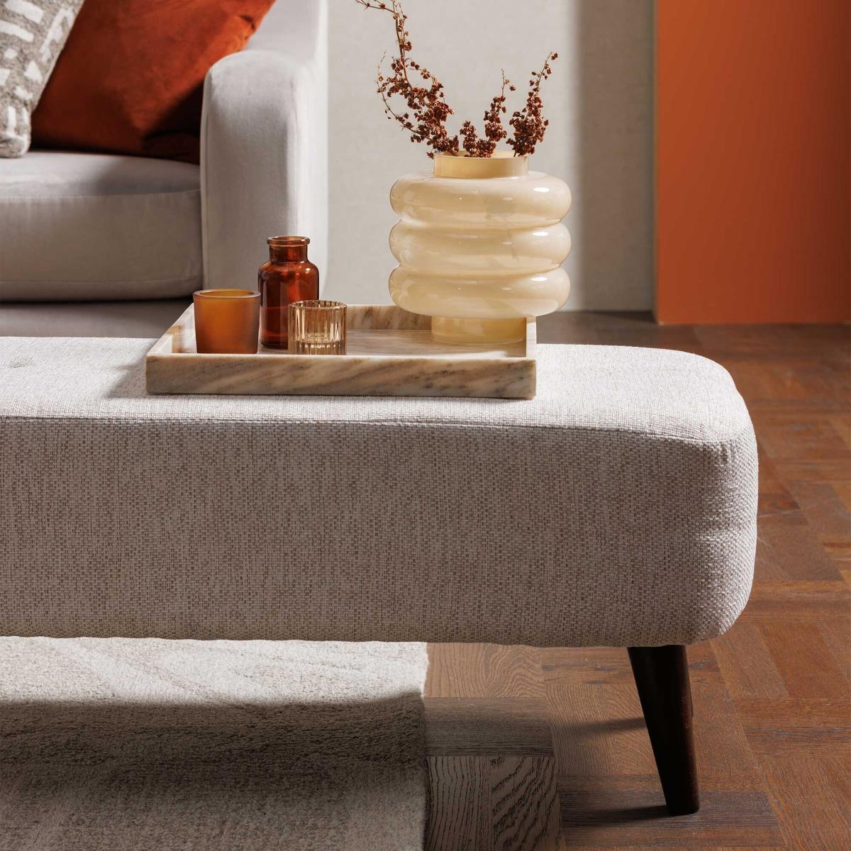 I love this bench stool for its clean, minimalist design and versatile appeal. It works particularly well in contemporary or Scandi-inspired interiors thanks to its understated silhouette and neutral fabric. It’s a practical piece - perfect as additional seating in a hallway, at the foot of a bed, or even in a living room as a casual resting spot or table alternative. When styling, consider pairing it with plush cushions or layered textures to add warmth, and don’t shy away from mixing it with other dark wood or metallic accents for a balanced look. Its neutral tone makes it adaptable across various colour schemes, making it a smart choice for spaces that need a functional yet stylish touch.