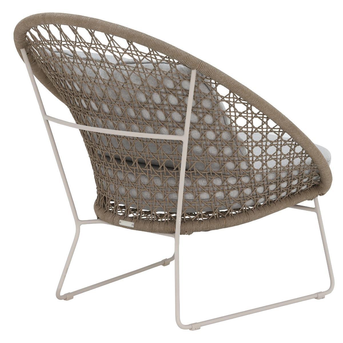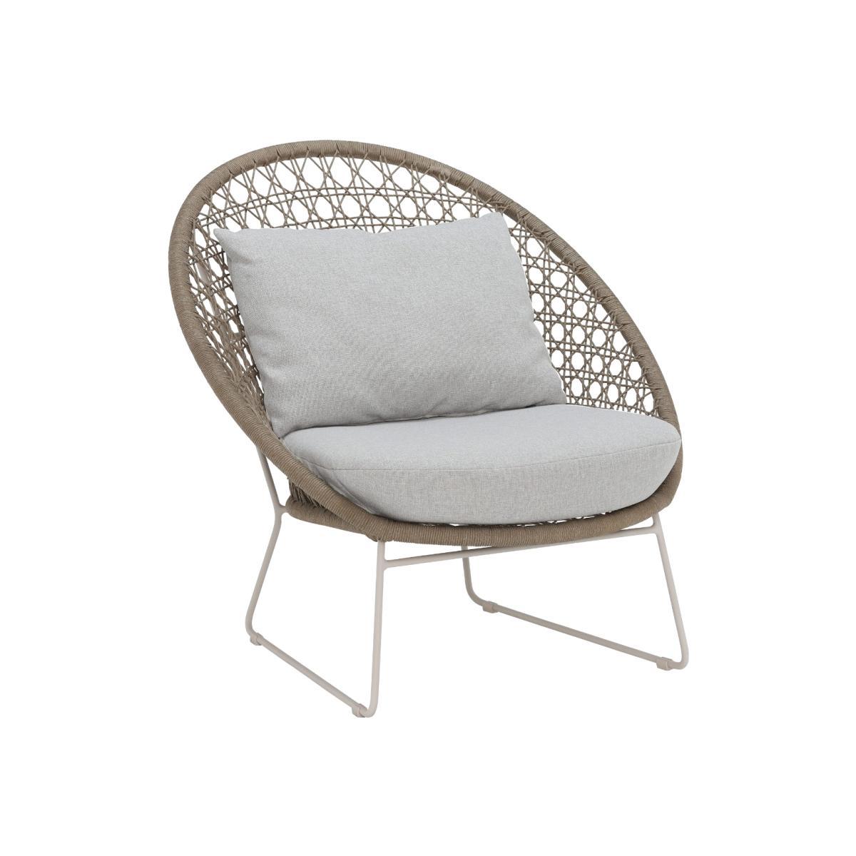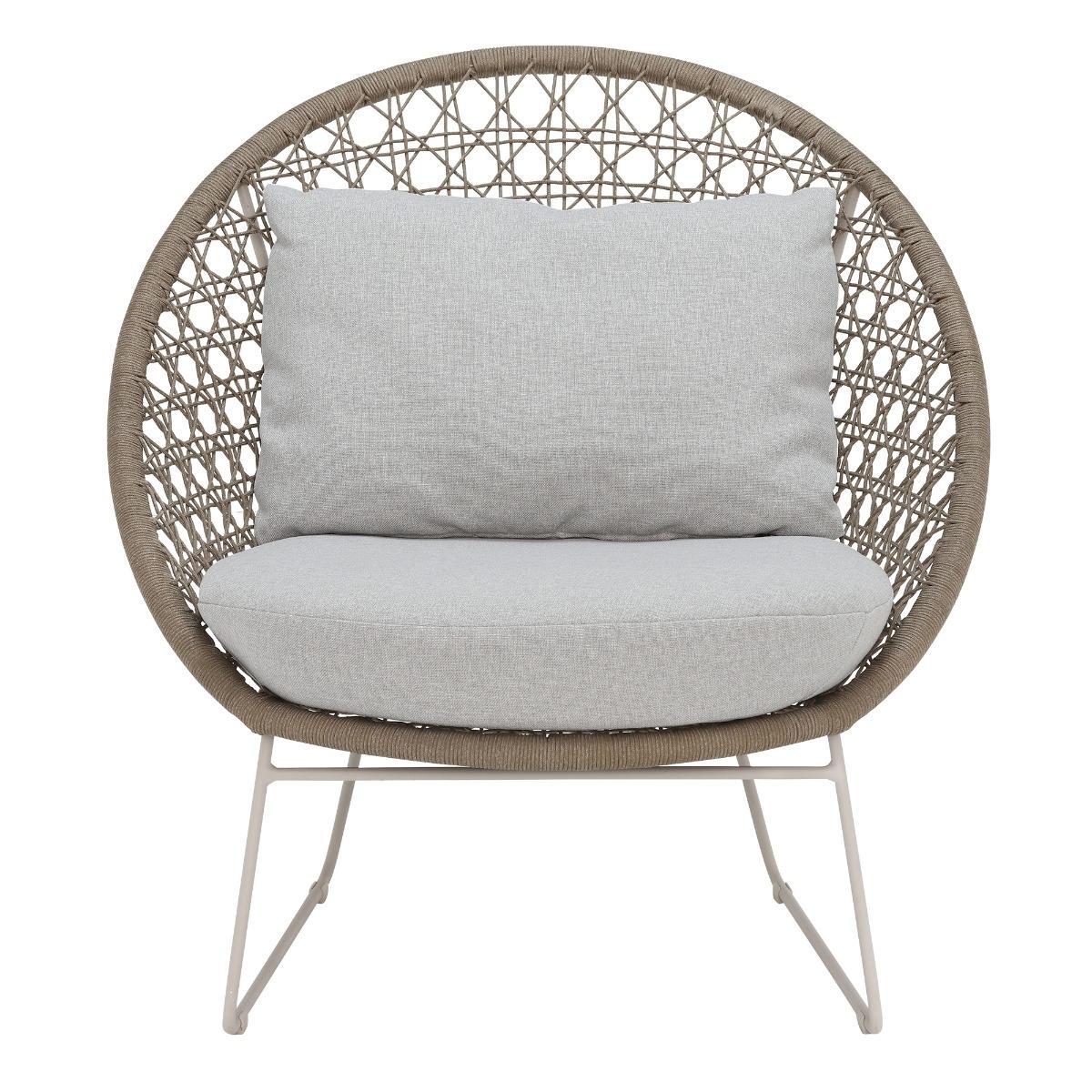 Design. In natural brown and grey tones for ultimate versatility, the Mykonos garden lounge chair features a woven rope design and plump seat cushions. Its circular shape is incredibly inviting, offering all-around support that you can really sink into. Set upon modern metal legs, this garden chair will fit well into many outdoor spaces.