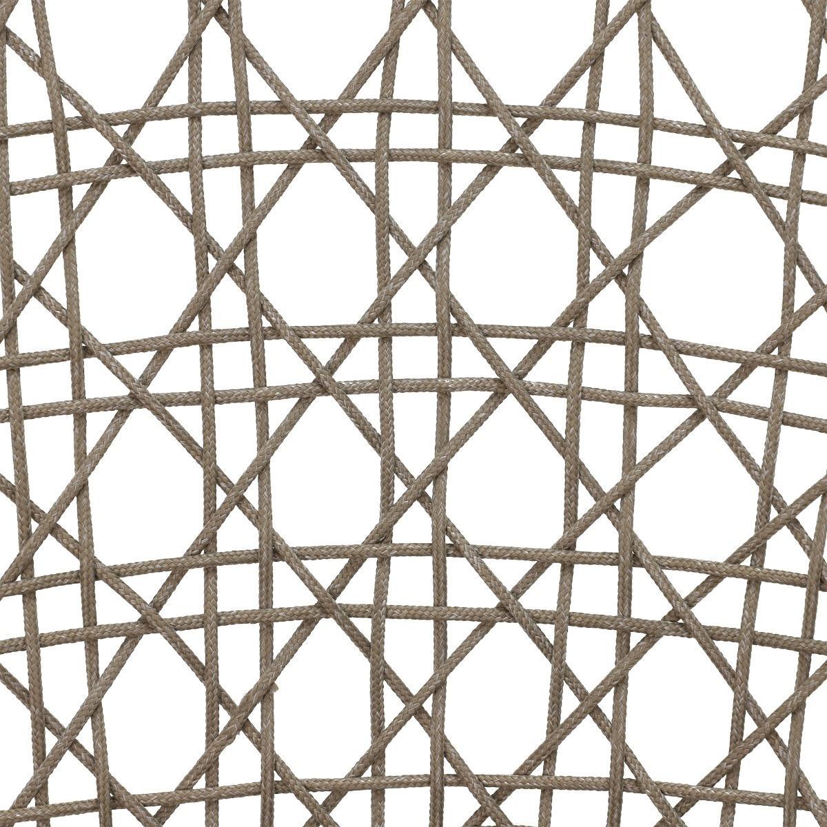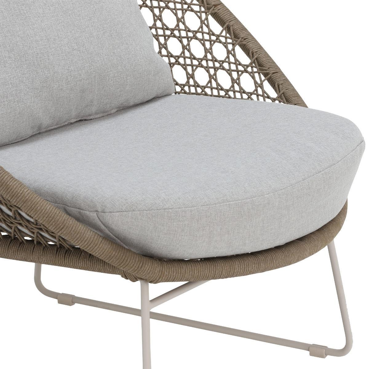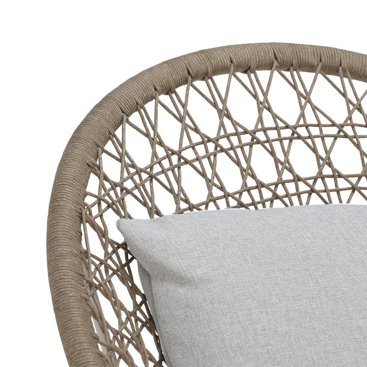 Design. In natural brown and grey tones for ultimate versatility, the Mykonos garden lounge chair features a woven rope design and plump seat cushions. Its circular shape is incredibly inviting, offering all-around support that you can really sink into. Set upon modern metal legs, this garden chair will fit well into many outdoor spaces.