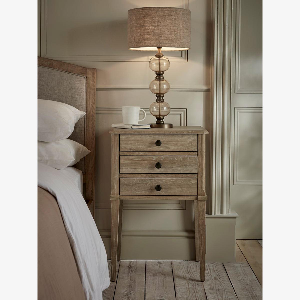 In a simple and elegant design, this bedside table adds a touch of serenity to your space. The light tones of the wood give a calm and relaxing feeling, whilst the black handles add an element of contemporary to a vintage design. With three drawers, this bedside table has plenty of storage. Pair with our Myla Bed Frame for the completed look.
