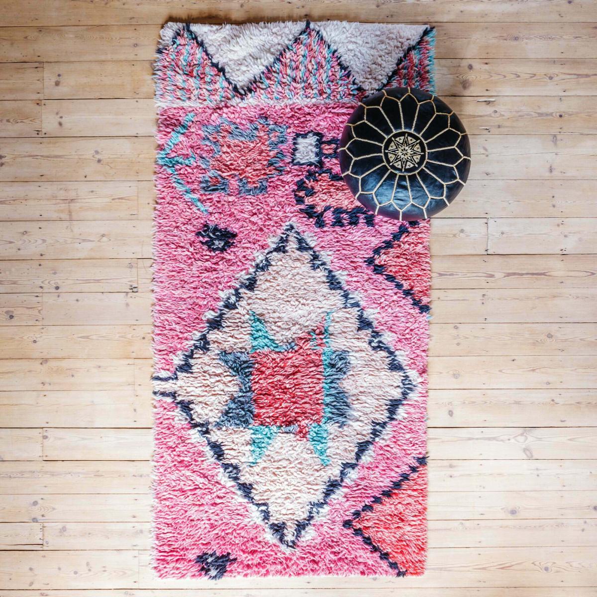 I love this small rug for its playful yet stylish vibe - it works particularly well in boho or eclectic interiors. Its vibrant pink and contrasting geometric pattern add a pop of colour and visual interest without overwhelming the space. The size makes it versatile for placing in the bedroom as a bedside rug, or in a living area to define a cosy corner. For styling tips, consider pairing it with neutral furniture to let the colours stand out, or layer it over a larger, more subdued rug for added texture. Its textured finish also adds warmth and comfort, making it a practical choice for tiled or wooden floors.