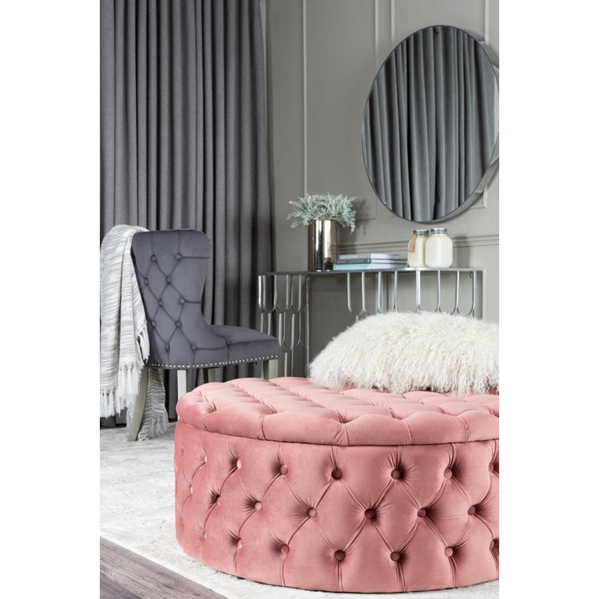 I love this blush pink ottoman for adding a touch of softness and elegance to a variety of interiors, from modern to French chic. Its tufted, plush fabric instantly elevates a space, making it a statement piece or a versatile extra seat or footrest. It works particularly well in living rooms with neutral palettes, where it can serve as a focal point, but also fits beautifully into bedrooms or dressing areas. For styling, consider pairing it with velvet cushions or metallic accents for added luxe, and keep the surrounding decor minimal to let the bold colour and texture really stand out. This piece is both practical and fashionable, offering plenty of storage while maintaining a chic aesthetic.