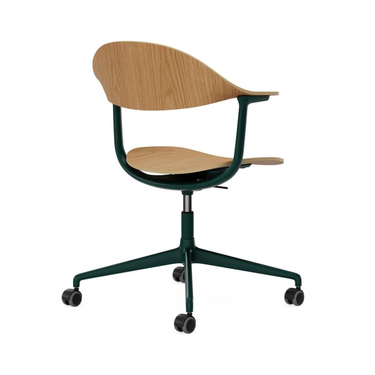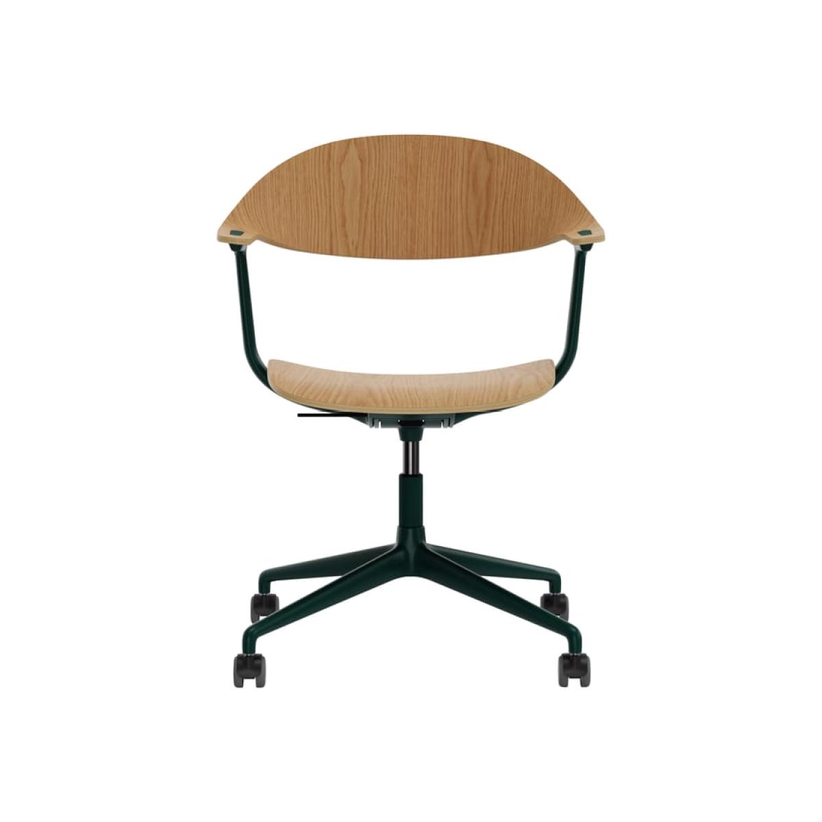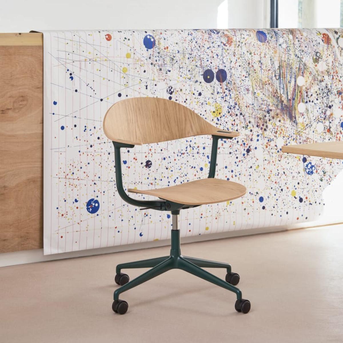 The Mynt Desk armchair stands out for its innovative approach, fusing minimalist aesthetics with ergonomic performance. Designed to fit any environment, from coworking space to home office to dining room, this versatile chair redefines comfort and style. Imagined under the vision of renowned designer Erwan Bouroullec, Mynt embodies functional elegance. Its clean, warm silhouette echoes the world of contemporary studios, while incorporating advanced technologies for an unprecedented seating experience. "In addition to the fact that Mynt had to have a certain performance, it had to be welcoming to any type of person, any type of task, at any time," explains Erwan Bouroullec. This Armchair offers revolutionary dynamic seating, where every movement keeps the body in Natural balance. Thanks to its lightweight, versatile design, Mynt blends harmoniously into modern desks, shared spaces or designer interiors. Its durable, future-proof design guarantees exceptional longevity: each component is individually replaceable, reducing environmental impact. With Mynt, combine aesthetics and comfort to transform your work or living space. Available in a range of colors and finishes, this armchair is the ideal answer for those looking for timeless, ergonomic design furniture. In detail: Variation : Oak / Bottle green Base, legs Brand : Vitra Designer : Erwan Bouroullec Type : Armchair on casters Colour : Seat & back : Natural oak - Structure :Bottle green Material : Back & seat: Natural oak moulded plywood veneer - Structure: Thermolacquered aluminium Dimensions :W 69 x D 69 cm x H 96 cm Weight : 26.4 lb Characteristics : 4 Legs on Casters - Dynamic seating experience - Swivel and height-adjustable seat - Seat damper - Adjustable backrest - Backrest flexes slightly when pressure is applied - Project date: 2025 Show less