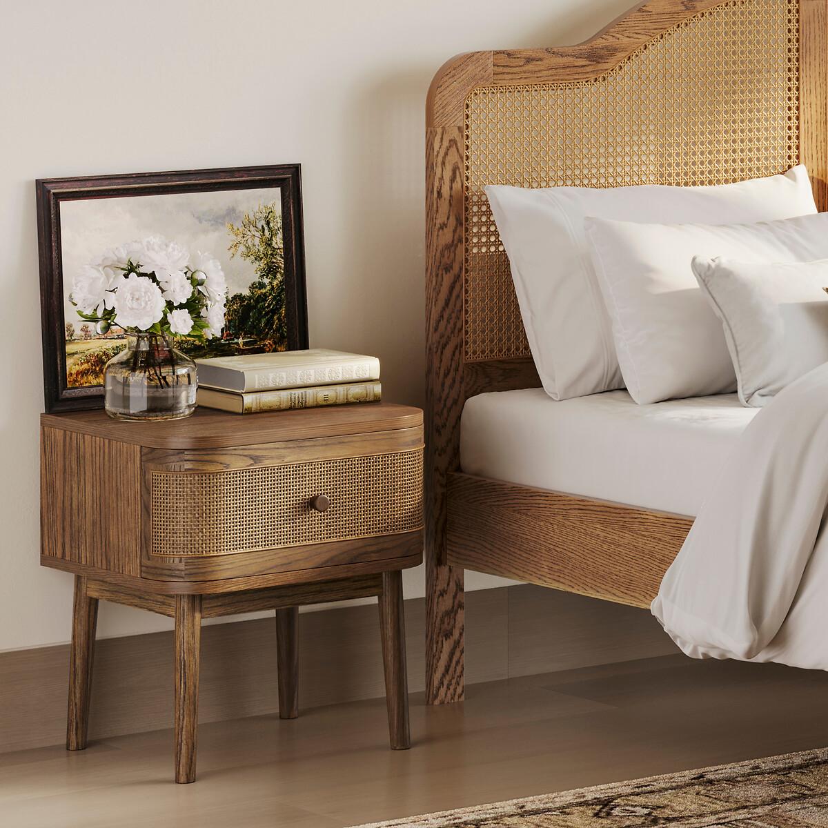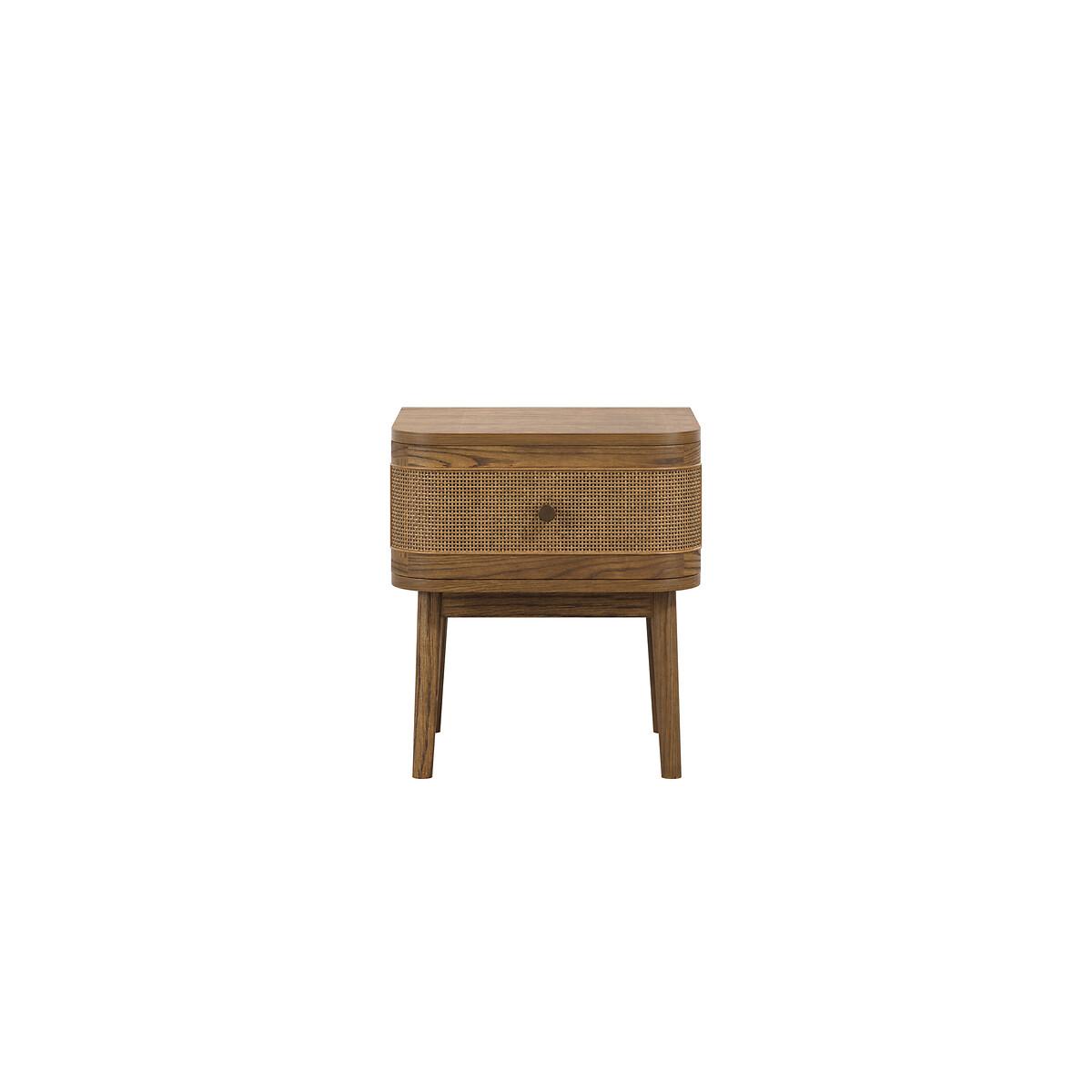 This boho bedside cabinet features rolling curves and a smoked wood finish which has the effect of darkening and highlighting the natural wood grain. The single drawer provides ample storage for nighttime essentials. Perfect for adding an earthy touch and textural interest to free-spirited bedrooms. Product Details • 1 drawer (standard close with drawer stoppers) • Curved edges • Rattan frontage • Matte woodgrain finish• Full assembly required• Care advice - clean with a damp cloth or duster. Product Composition - MDF, Rattan Weave. Product Dimensions - 40 cm x 45 cm x 50 cm , Weight - 9 KGPackage Dimensions - 52 cm x 48 cm x 35 cm, Weight 15 KGPlease note: this product cannot be be delivered to all Offshore Islands, Scottish Highlands, Northern Ireland or Republic of Ireland. This product will be dispatched by one of our trusted suppliers. You’ll be contacted by their selected courier about your delivery.