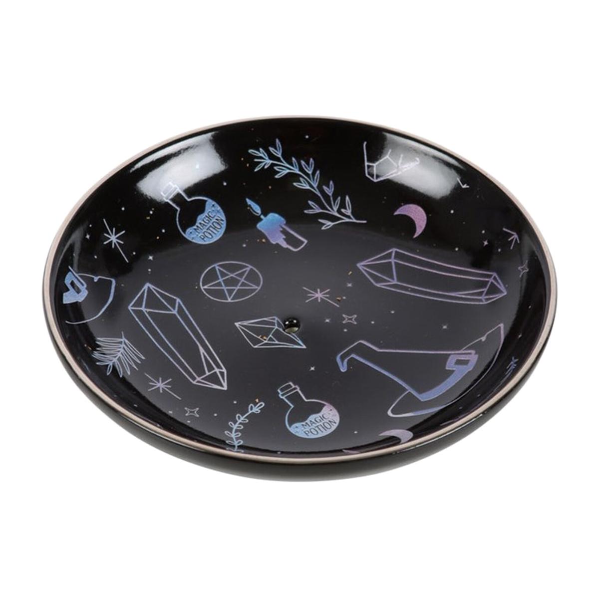 Perfect for crystal collectors and witchcraft enthusiasts, this trendy black incense dish is adorned with designs of crystals, witch hats and potions. The holder is thoughtfully designed to accommodate both incense sticks and cones, featuring a small hole in the centre for sticks and a flat stable surface for burning cones. A mystical finishing touch for any home with witchy decor.