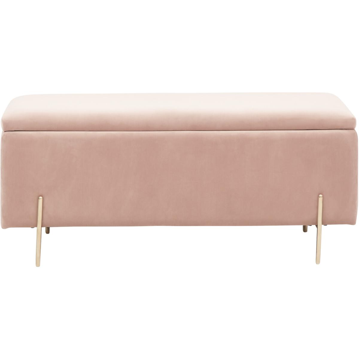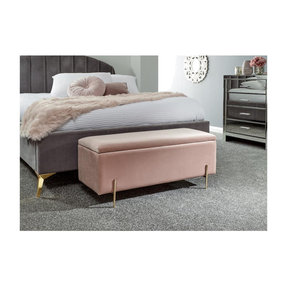 Every bedroom needs a storage box and this Mystica Ottoman Storage Bench is the perfect choice. The simple design makes it a good match for most interiors, pick from a selection of in vogue colourways to suit your style. The ottoman has a hinged lid and features a generous lined compartment that's ideal for extra bedding and cushions. Both frame and seat are upholstered in a tactile plush fabric with a matt velvet pile that looks and feels indulgent. The simple gold effect metal legs add to the minimalist look and feel.