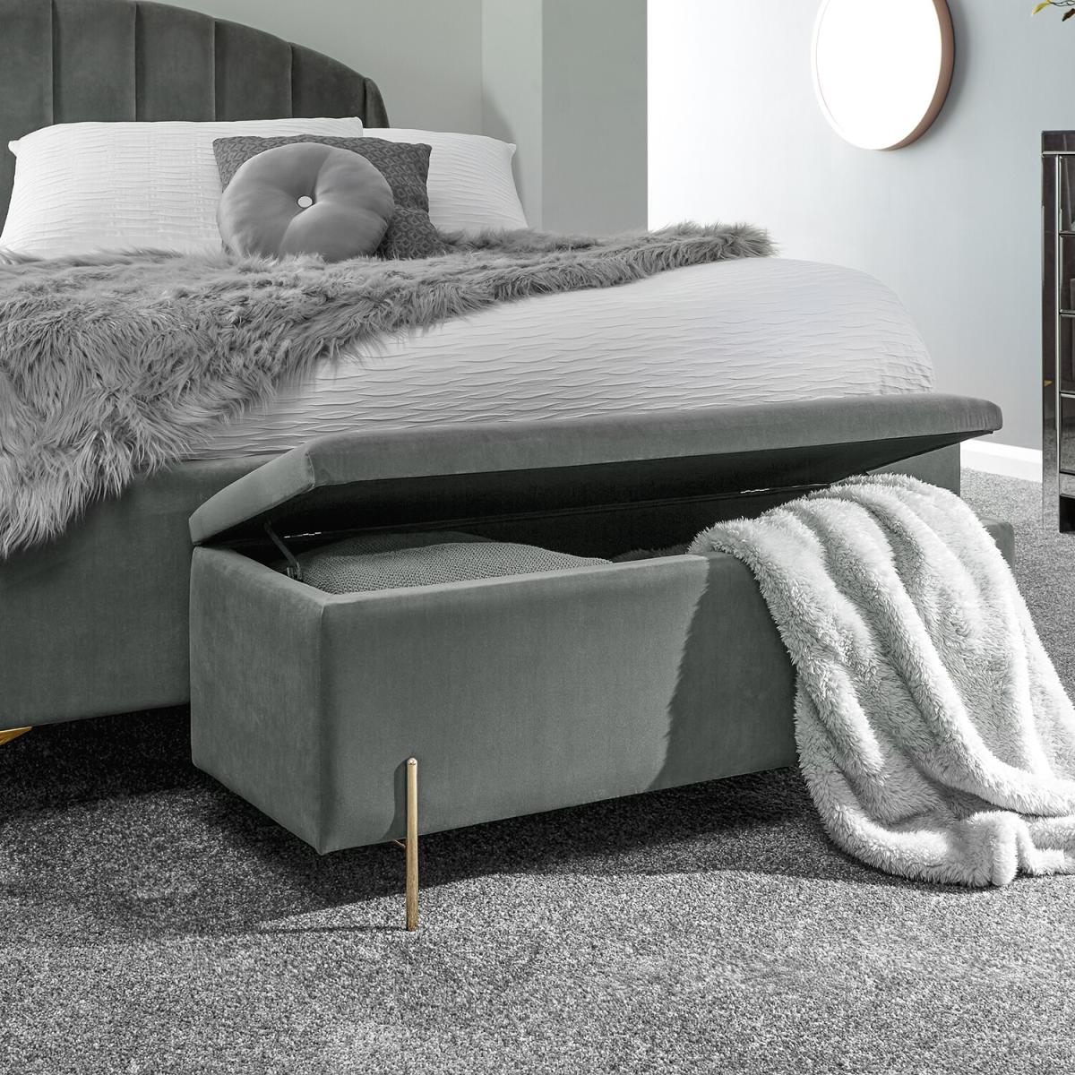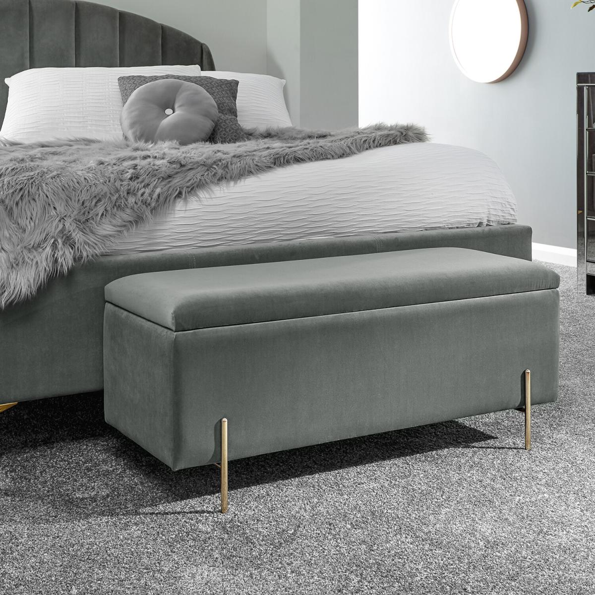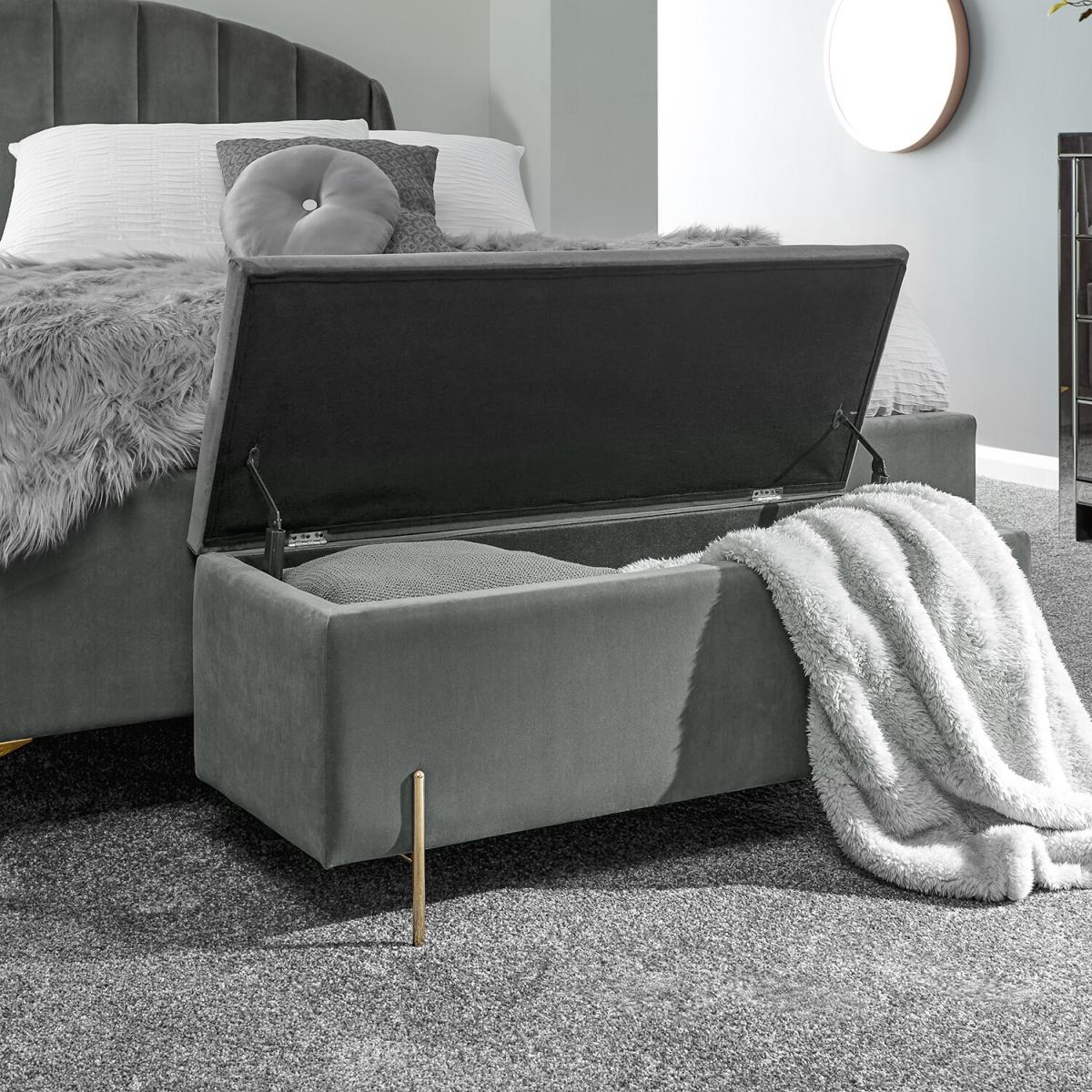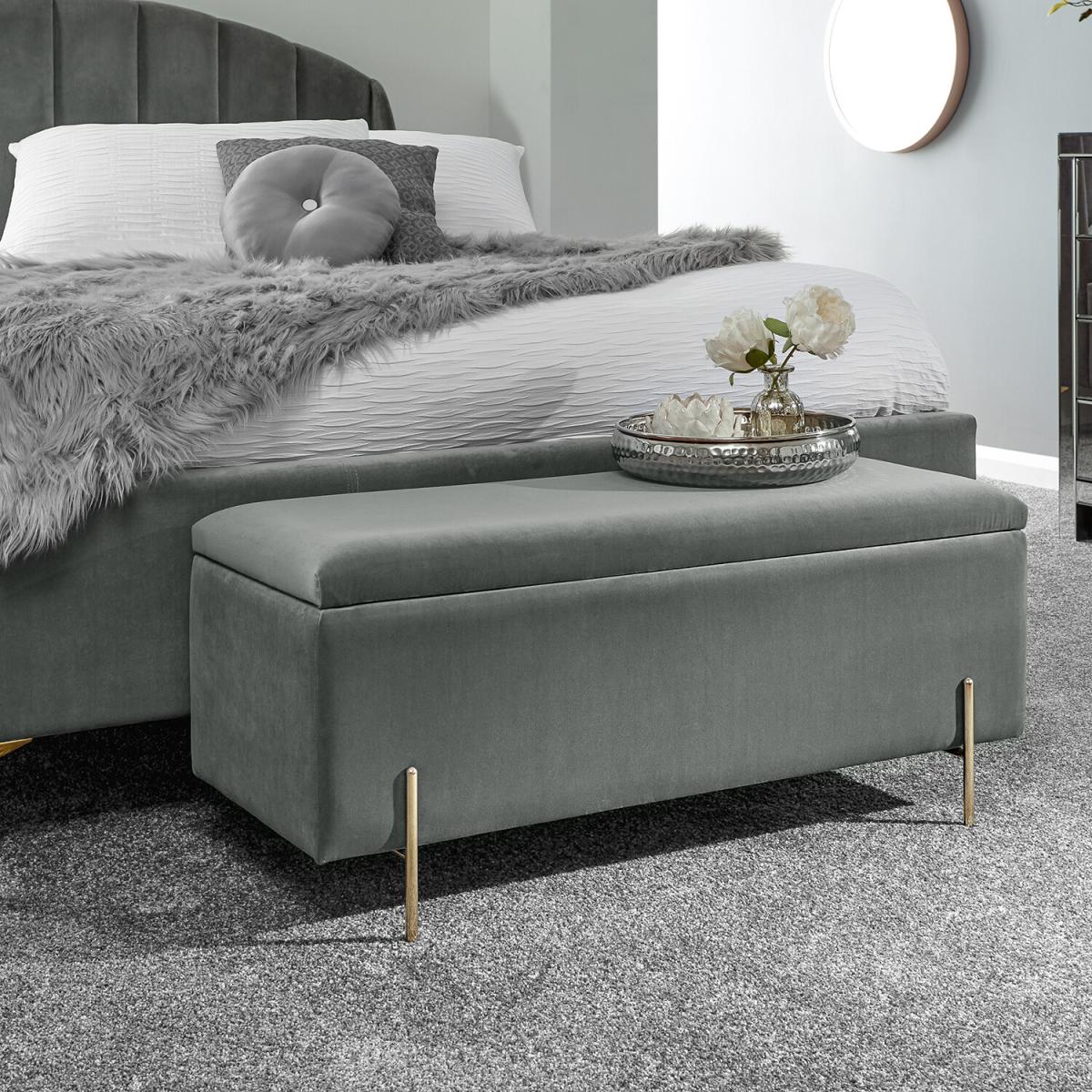 Every bedroom needs a storage box and this Mystica Ottoman Storage Bench is the perfect choice. The simple design makes it a good match for most interiors, pick from a selection of in vogue colourways to suit your style. The ottoman has a hinged lid and features a generous lined compartment that's ideal for extra bedding and cushions. Both frame and seat are upholstered in a tactile plush fabric with a matt velvet pile that looks and feels indulgent. The simple gold effect metal legs add to the minimalist look and feel.