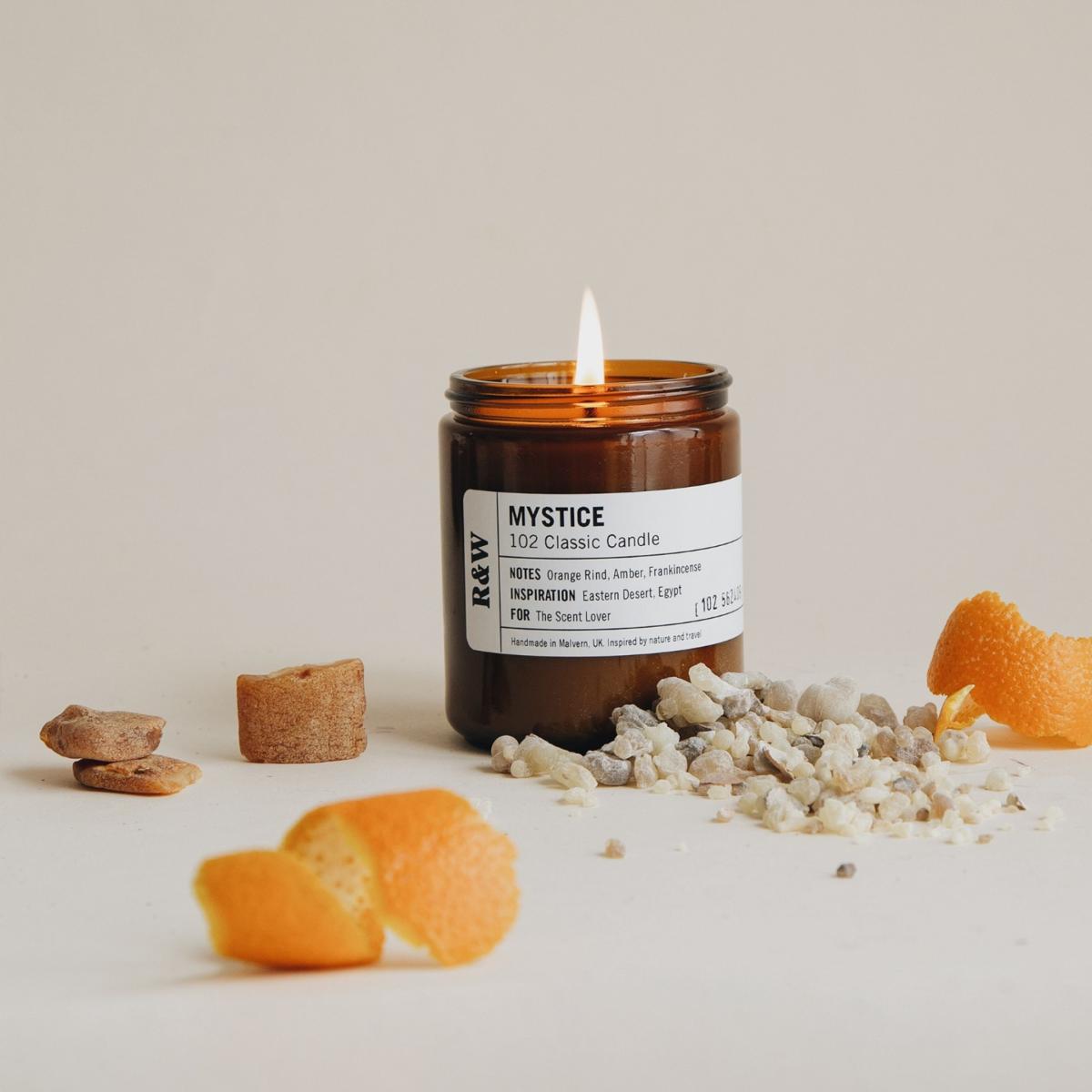 Citrusy orange rind sets a bitter but light tone, followed by sweet amber and rounded off with slightly spicy frankincense and warm, woody myrrh. A scent resembling the mysterious nature of an African desert. Our most-popular size, the classic candle fits all occasions and fragrances every type of room or space. Made using 100% soy wax and set in an amber glass jar with a single cotton/linen mix wick, topped with an aluminium screw top lid. Enclosed within a signature Russell & White box, inspired by the hills in our hometown of Malvern.