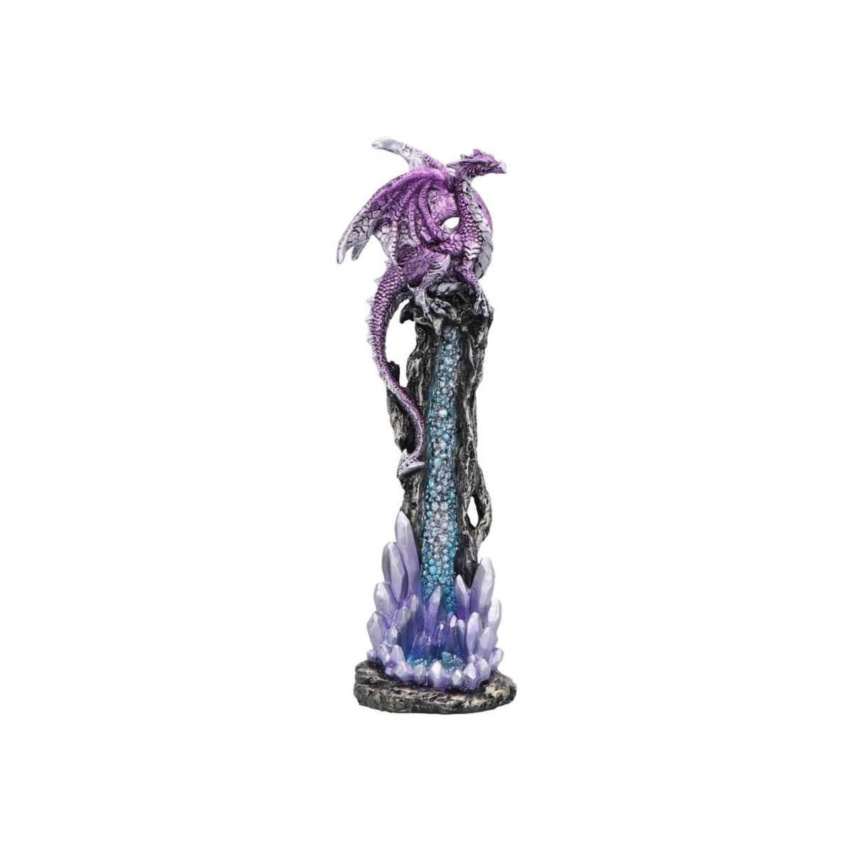 The Mythic Crystal Incense Holder is a beautifully crafted resin figurine featuring a crystal base with a purple dragon perched on top. Its designed to hold incense sticks and is perfect for anyone who loves fantasy and mystical decor. The light blues and purples shimmer for a magical touch, making it a standout piece.