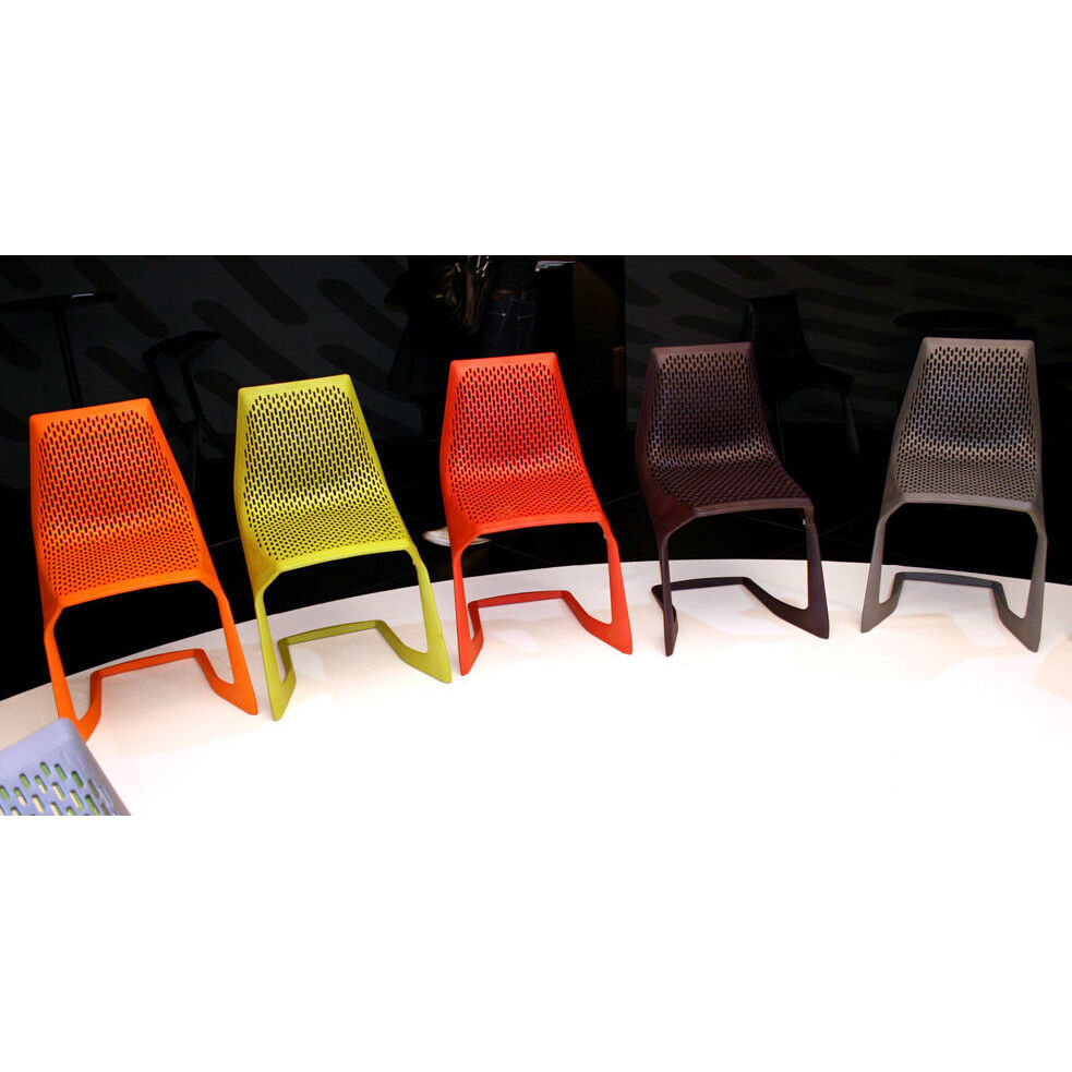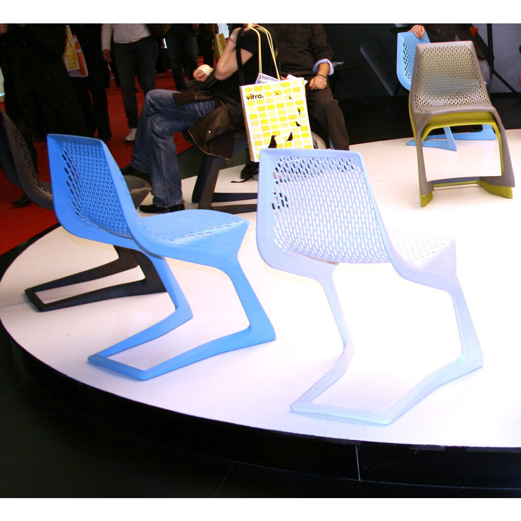 "MYTO is a plastic chair, which is strong, comfortable, light, stackable, compact and comes in a coolly angular shape that is made from a single piece of plastic using (eco-responsibly, of course) the minimum material possible. Grcic has designed many chairs over the years, but had never dared to attempt the most challenging type of all: a cantilever chair with no back legs that's supported by its own structure. Cantilever chairs are shrouded by modernist mystique, as so few have been made, and the best known examples are among the most famous designs of the 20th century, like Marcel Breuer's 1920s tubular steel chairs, Verner Panton's sexy 1960s plastic chair. ""It's a no-go area, because it is the icon of modern furniture design,"" said Grcic. Grcic wanted his chair to seem light and supple, with a perforated seat and back. ""The perforations look quite like an animal skin, and the chair has a reptilian quality with a precise outline and roundish, but tense surfaces,"" he said. ""Sometimes animals assume that position when they're ready to pounce. """.