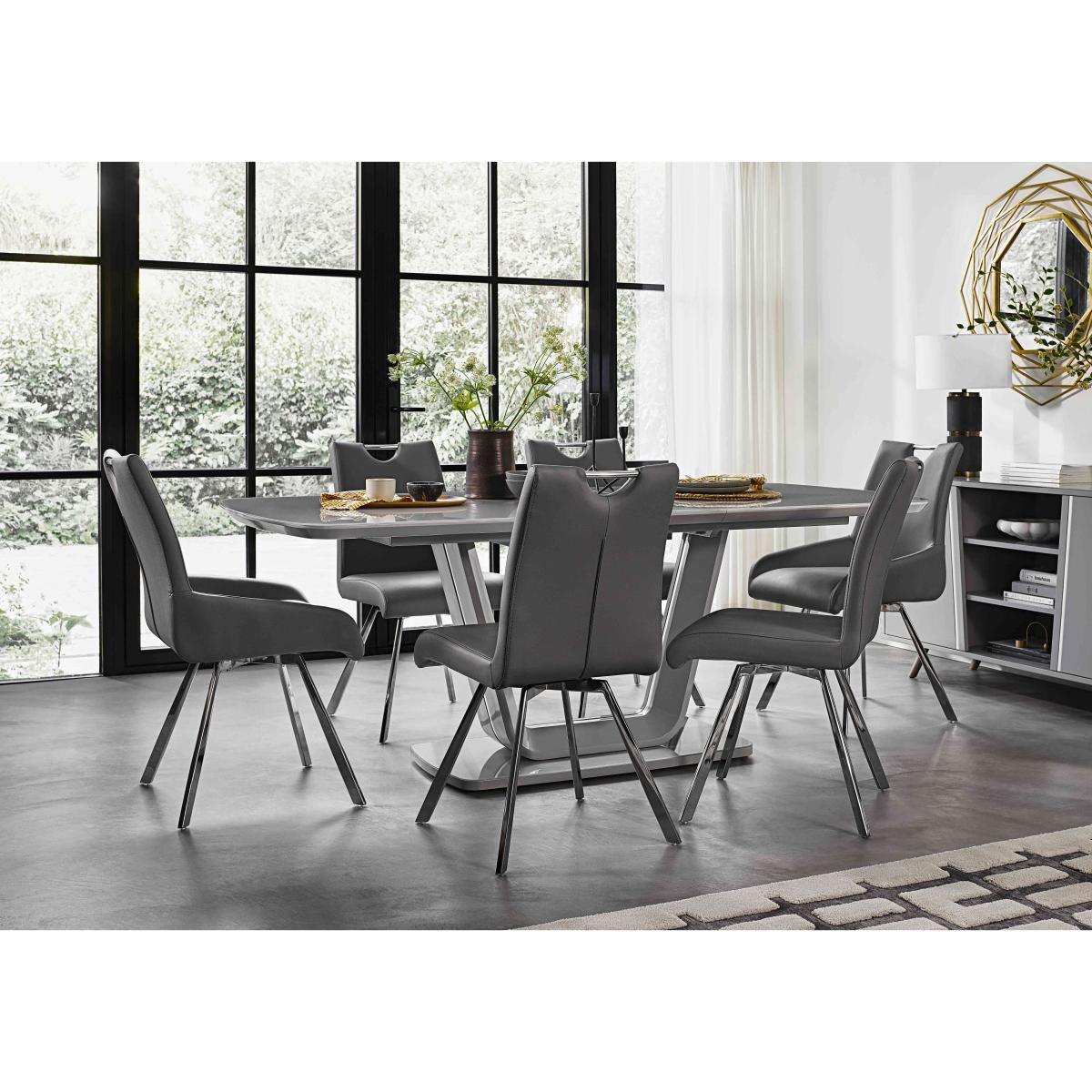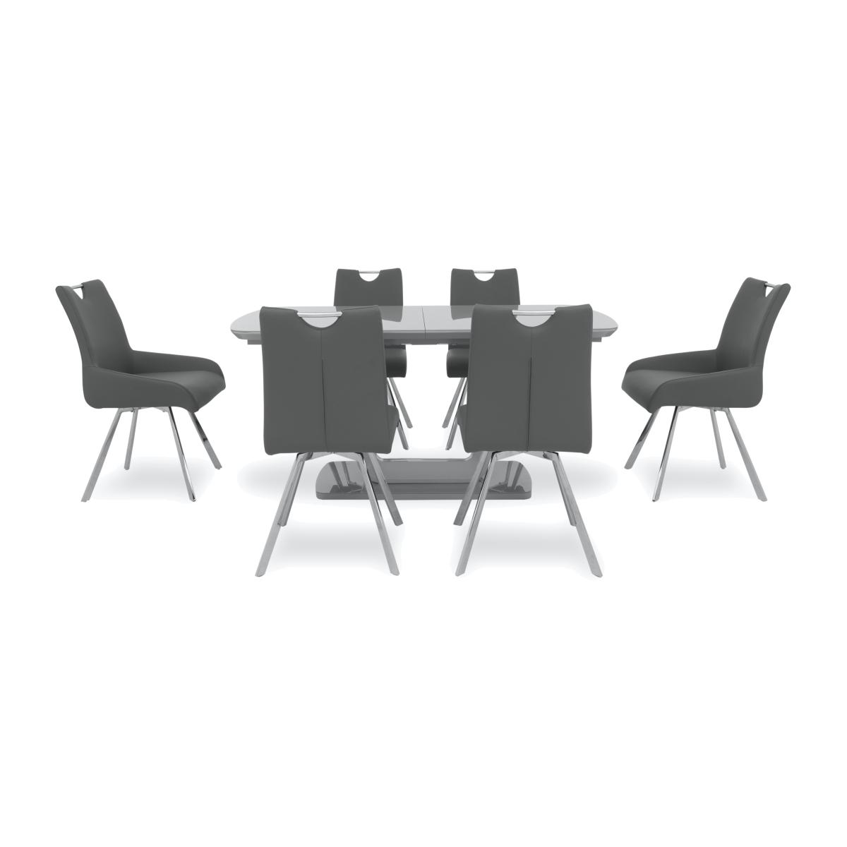 Showcasing a wide choice of statement living and dining furniture for compact spaces, our Nadal range makes it easy and affordable to create an impactful modern home. The look is bold and confident – tables have glass tops and U-shaped pedestal bases, storage pieces give shelving an asymmetric twist, and every piece has that gorgeous high-gloss finish. Across the range you’ll notice thoughtful ergonomic features. The dining table extends to seat eight, the bar table is designed to make the most of a kitchen diner, and dining chairs and bar stools have space-saving swivel bases. The Nadal range is exclusively available at Furniture Village. Make the most of a smaller dining space with this very cool modern dining set. The extending dining table has a high-gloss finish, glass top and pedestal base and comes with six swivel dining chairs. Why you'll love it Cool, compact and with a fabulous high-gloss finish. Striking modern dining set at a great-value price. Extending dining table has a tough tempered glass top. Stylish U-shaped pedestal base makes it easy to seat the whole family. Seats 6. A smooth butterfly mechanism extends it to seat 8. Set includes 6 swivel dining chairs, including 2 arm chairs, with chrome-effect legs. Chairs are supportive, curved and well cushioned. Elegant dark grey faux leather upholstery. Only at Furniture Village. This dining set is part of our Nadal range. What you need to know Dining chairs have foam seat cushioning, and metal frames and legs. Please note that under direct light, the glass table top may show very small surface scratches as a result of the polishing process. Tempered glass should be moved carefully. Replace immediately if damaged. We recommend using coasters and placemats at all times. Shop our exclusive Nadal range for a huge choice of modern living and dining furniture.