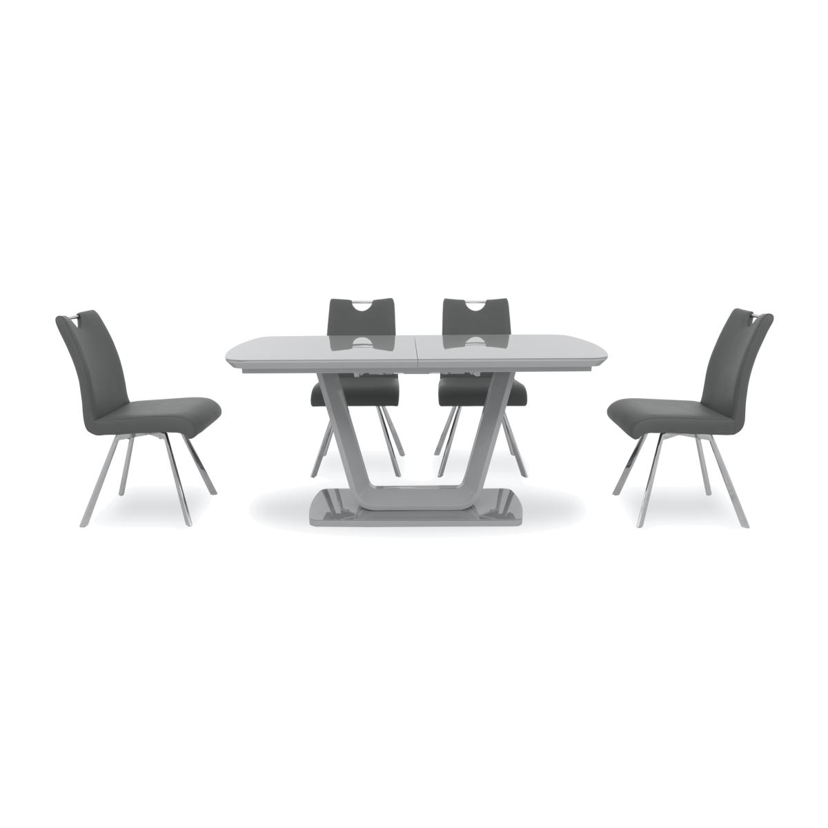 Showcasing a wide choice of statement living and dining furniture for compact spaces, our Nadal range makes it easy and affordable to create an impactful modern home. The look is bold and confident – tables have glass tops and U-shaped pedestal bases, storage pieces give shelving an asymmetric twist, and every piece has that gorgeous high-gloss finish. Across the range you’ll notice thoughtful ergonomic features. The dining table extends to seat eight, the bar table is designed to make the most of a kitchen diner, and dining chairs and bar stools have space-saving swivel bases. The Nadal range is exclusively available at Furniture Village. Smaller dining room? Innate sense of style? Then you’ll love this compact modern dining set. The extending dining table has a sleek high-gloss finish and the set includes four swivel dining chairs. Why you'll love it Cool, compact and with a fabulous high-gloss finish. Striking modern dining set at a great-value price. Extending dining table has a tough tempered glass top. Stylish U-shaped pedestal base makes it easy to seat the whole family. Seats 6. A smooth butterfly mechanism extends it to seat 8. Set includes 4 swivel dining chairs with chrome-effect legs. Chairs are supportive, curved and well cushioned. Elegant dark grey faux leather upholstery. Only at Furniture Village. This dining set is part of our Nadal range. What you need to know Dining chairs have foam seat cushioning, and metal frames and legs. Please note that under direct light, the glass table top may show very small surface scratches as a result of the polishing process. Tempered glass should be moved carefully. Replace immediately if damaged. We recommend using coasters and placemats at all times. Shop our exclusive Nadal range for a huge choice of modern living and dining furniture.