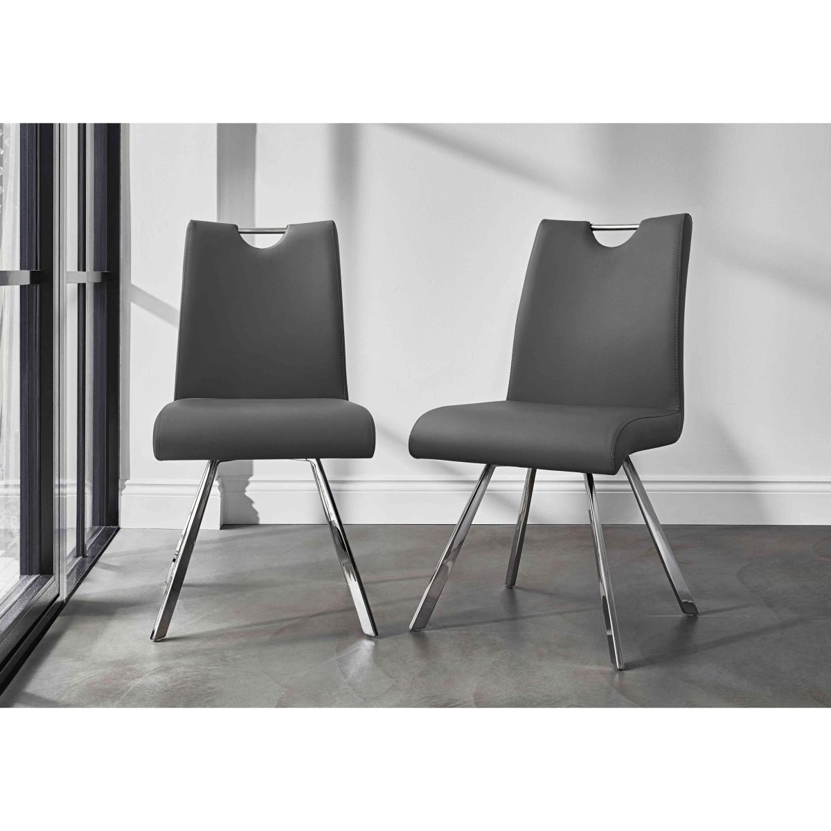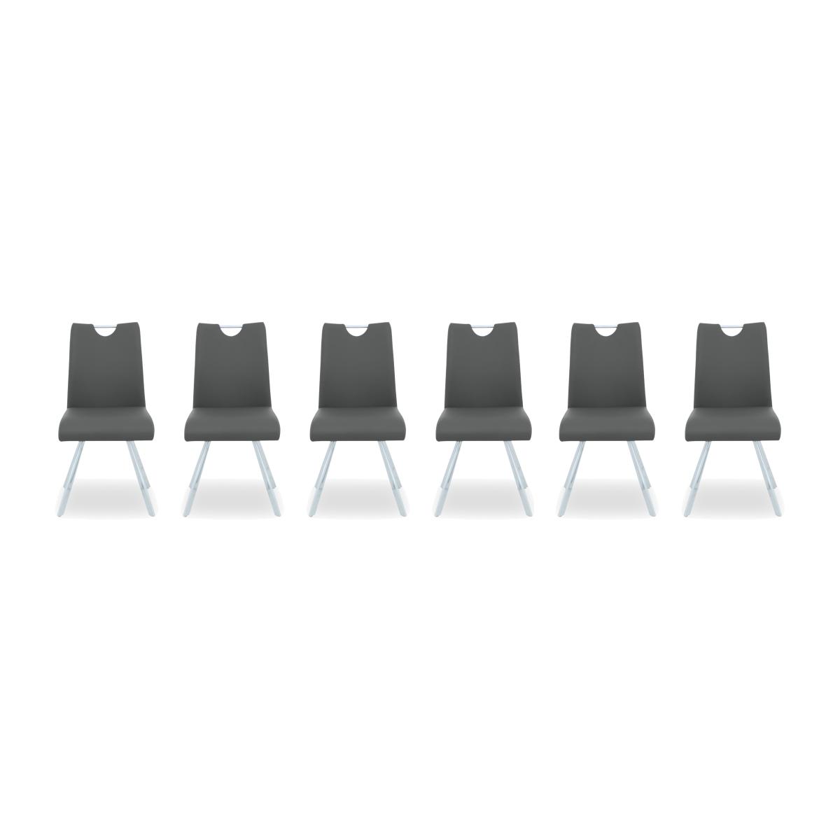 Showcasing a wide choice of statement living and dining furniture for compact spaces, our Nadal range makes it easy and affordable to create an impactful modern home. The look is bold and confident – tables have glass tops and U-shaped pedestal bases, storage pieces give shelving an asymmetric twist, and every piece has that gorgeous high-gloss finish. Across the range you’ll notice thoughtful ergonomic features. The dining table extends to seat eight, the bar table is designed to make the most of a kitchen diner, and dining chairs and bar stools have space-saving swivel bases. The Nadal range is exclusively available at Furniture Village. This set of six dining chairs suits almost any style of dining table. Chairs are modern and elegant and have ergonomic swivel bases and versatile dark grey upholstery. Why you'll love it Striking modern dining chairs set at a great-value price. Comfortable, ergonomic design – swivel bases and integrated handles. Supportive, curved and well cushioned. Chrome-effect metal legs. Elegant dark grey faux leather upholstery. Also available in sets of 2 and 4 dining chairs. Only at Furniture Village. This set of 6 swivel dining chairs is part of our Nadal range. What you need to know Foam seat cushioning, metal frames and legs. Shop our exclusive Nadal range for a huge choice of modern living and dining furniture.