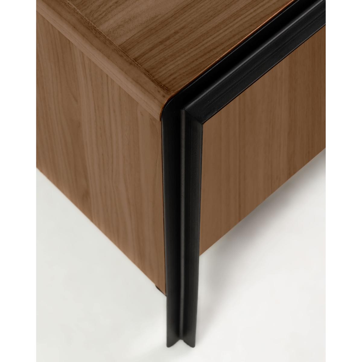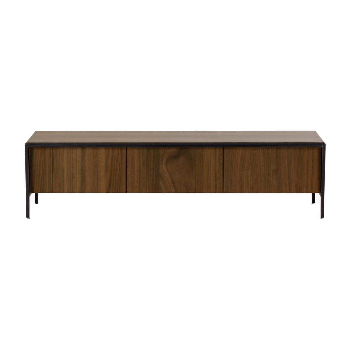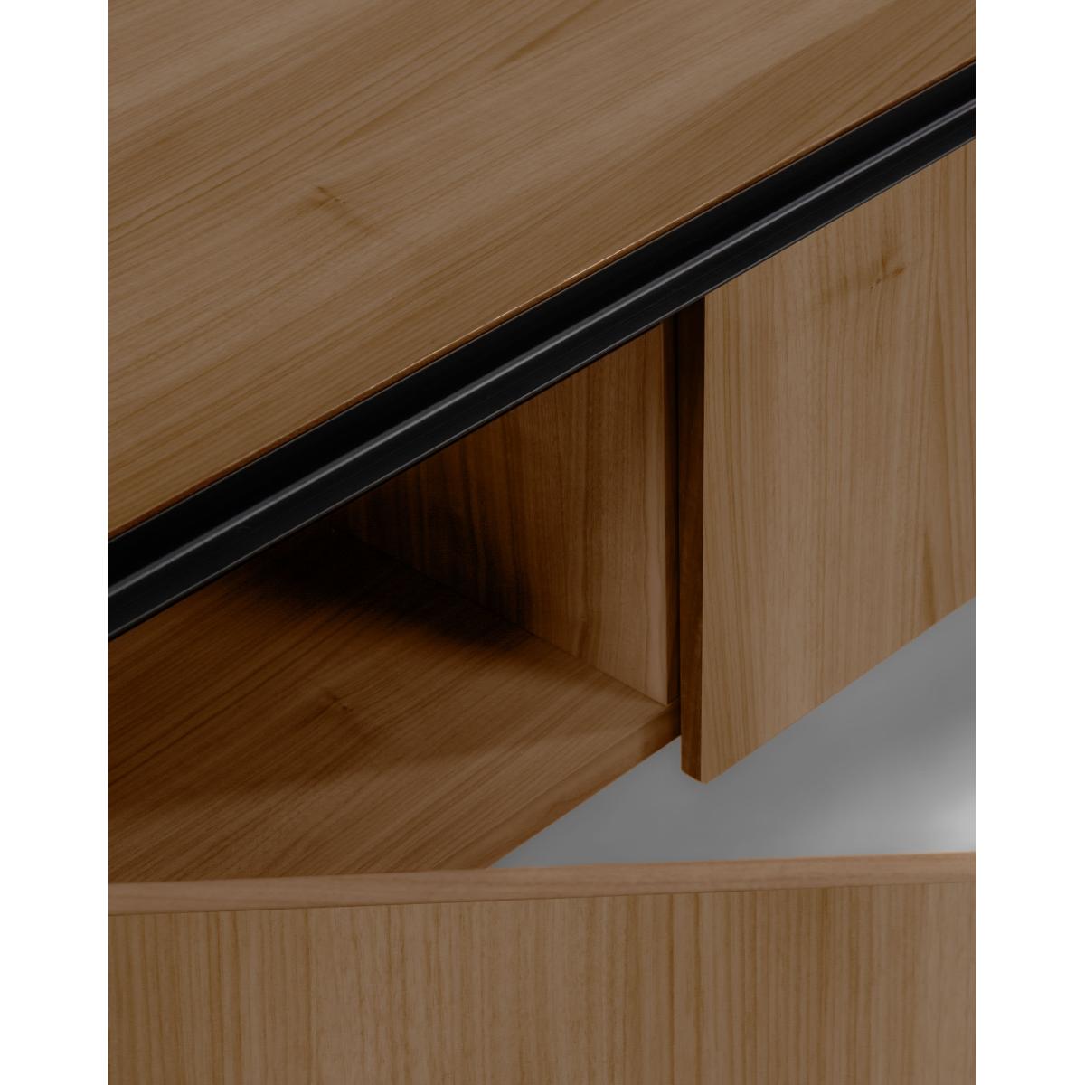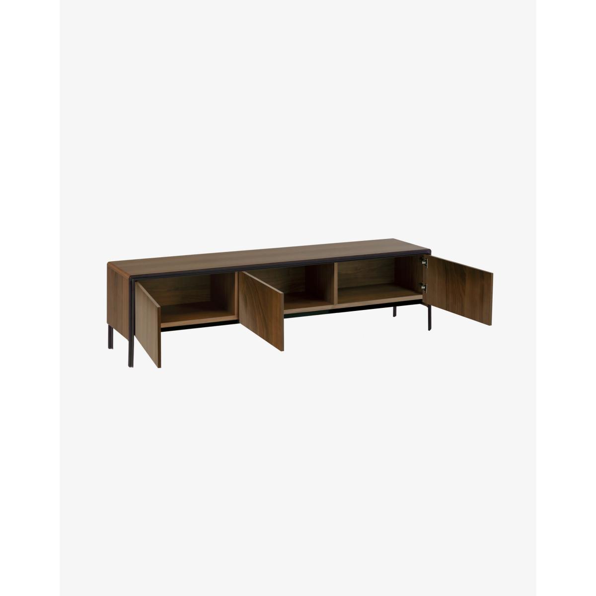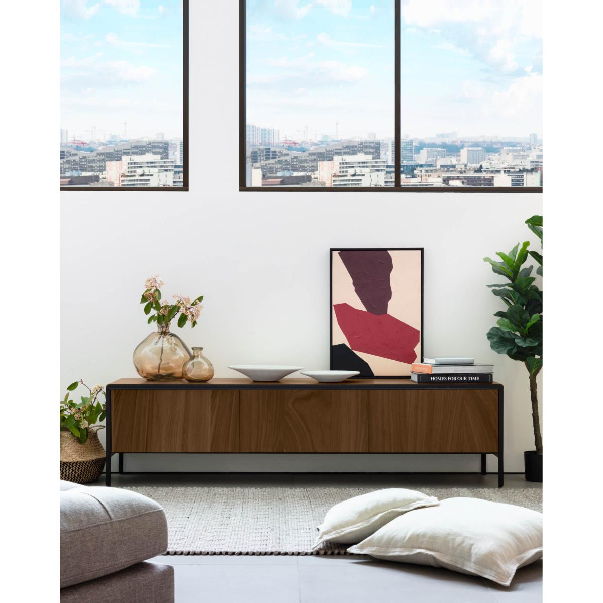 I really like this walnut veneer TV stand for its clean lines and warm, natural finish, which adds a sophisticated yet inviting touch to any living space. The black steel accents give it a contemporary edge, making it versatile enough to work across modern, Scandinavian, or even industrial interiors. Its generous 180 cm length provides ample space for media devices, with plenty of surface area for styling or additional organisation. For practical tips, consider pairing it with minimalist decor for a sleek look or layering with textured accessories like woven baskets or soft textiles to soften the overall aesthetic. It works particularly well in open-plan living rooms or larger media areas where its generous size and elegant finish can be truly appreciated.