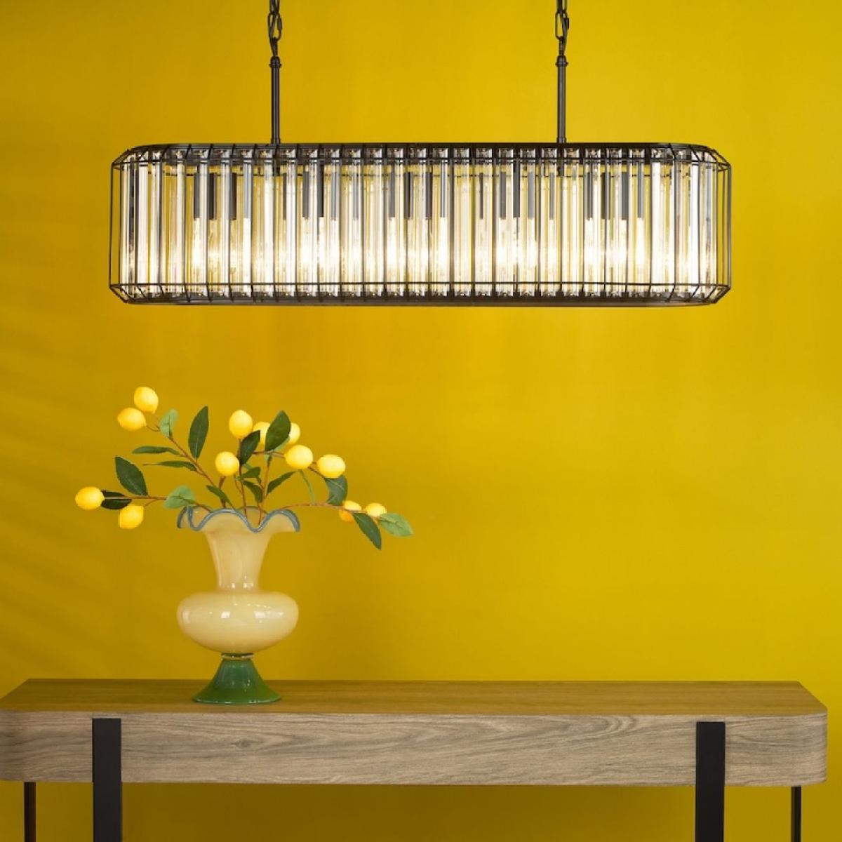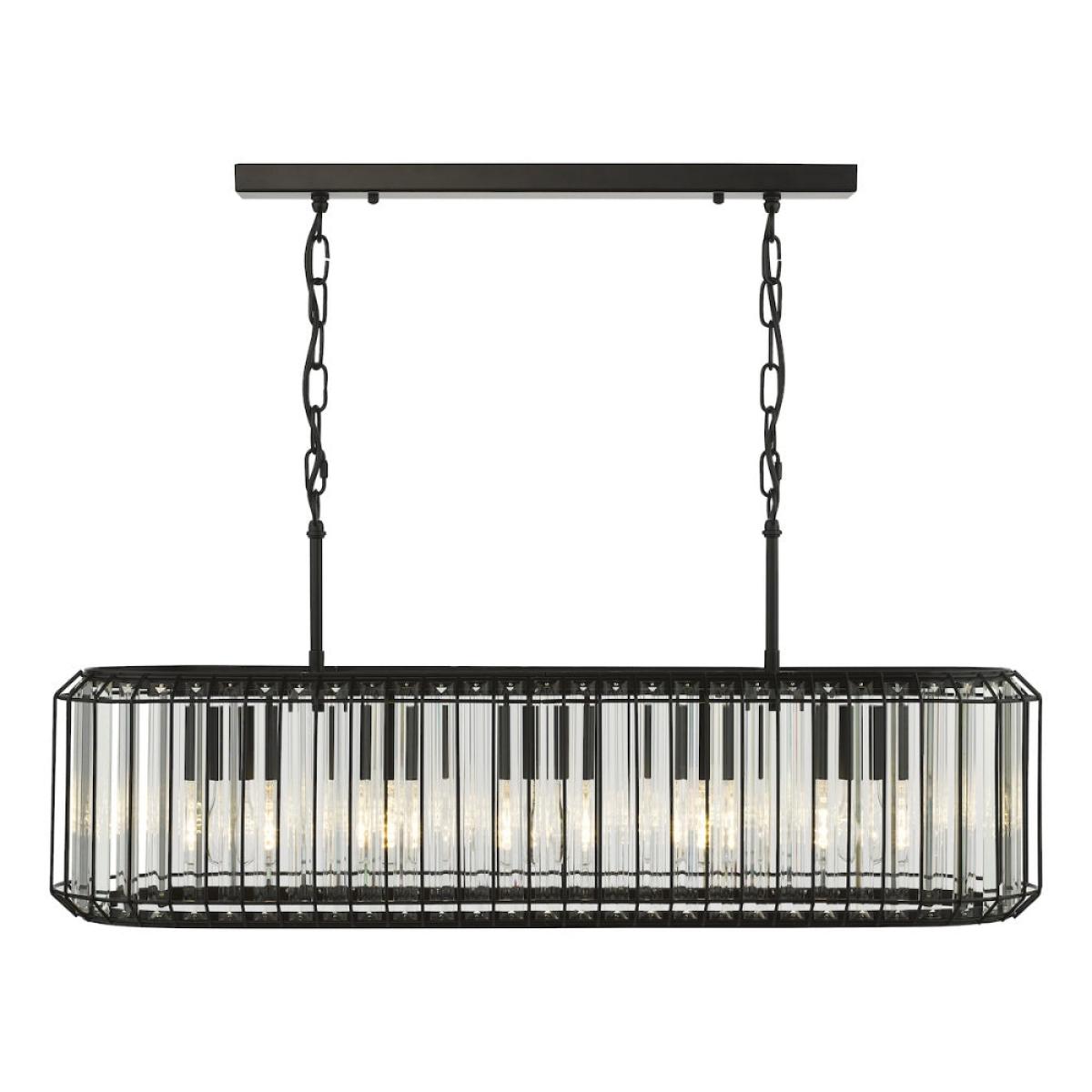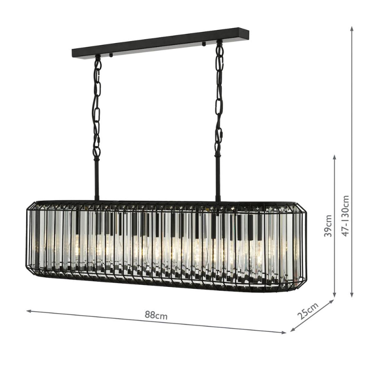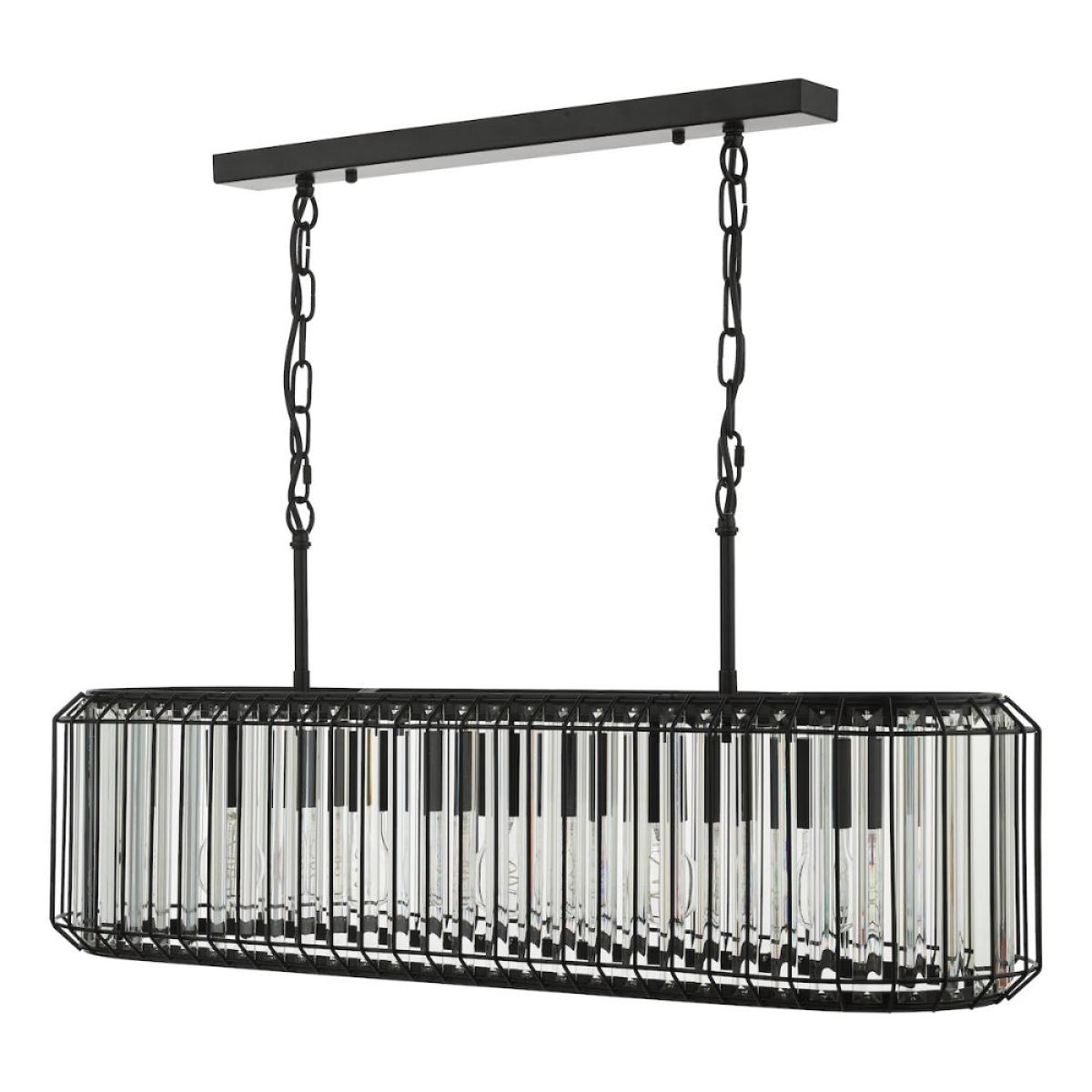 The Naeva 5-Light Matte Black and Crystal Pendant blends modern refinement with subtle industrial influence, creating a striking centrepiece for kitchens, dining rooms and reception areas. Its satin black steel frame is paired with faceted crystal droppers that catch and refract the light, adding depth and sparkle without overpowering the space. It's perfectly proportioned for dining tables or kitchen islands, offering generous illumination with a touch of glamour. The Naeva pendant brings balance, style and sophistication to contemporary interiors. Product dimensions: H39xL88xD2. 5 cm Adjustable drop at the point of installation - 140 to 47 cm (including the shade height) Dimmable Requires 5x ES27 GLS bulbs