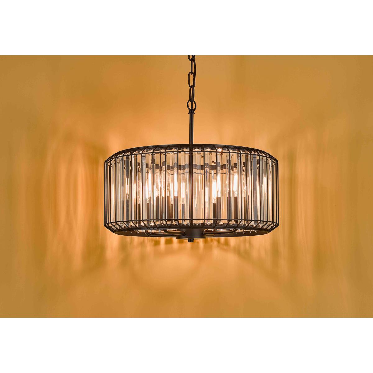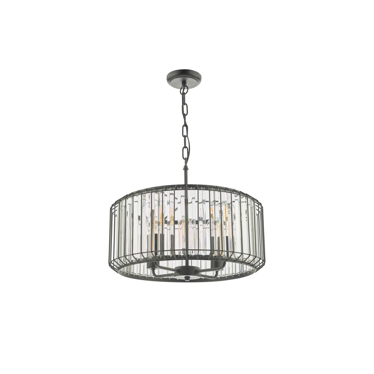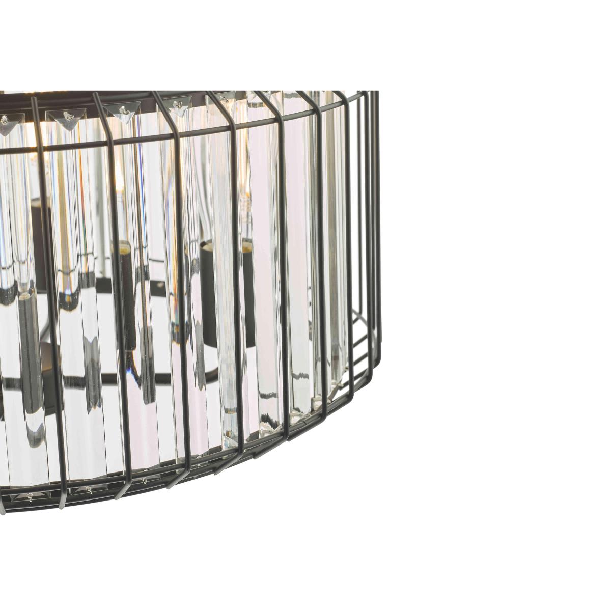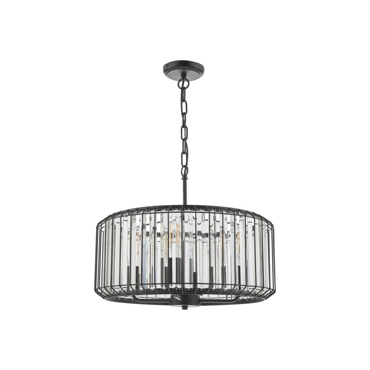 The faceted crystal shade surrounding this pendant’s four-lamp candelabra casts lovely light while the black metal cage gives it an urban edge. Why you'll love it. This bold contemporary pendant light blends industrial cool with effortless elegance. Refined industrial style. A faceted crystal shade encircles a 4-light candelabra creating sparkling light. A black satin-finished metal cage completes this pendant’s on-trend urban look. Height adjustable on installation. This pendant light is part of the Furniture Village accessories collection. What you need to know. Made of metal and glass. Supplied with 100 cm black chain and cable. Requires 4 x 25W E14 bulbs, not supplied. Dimensions. Height: 25 cm (10 in). Depth: 48 cm (19 in). Width: 48 cm (19 in).